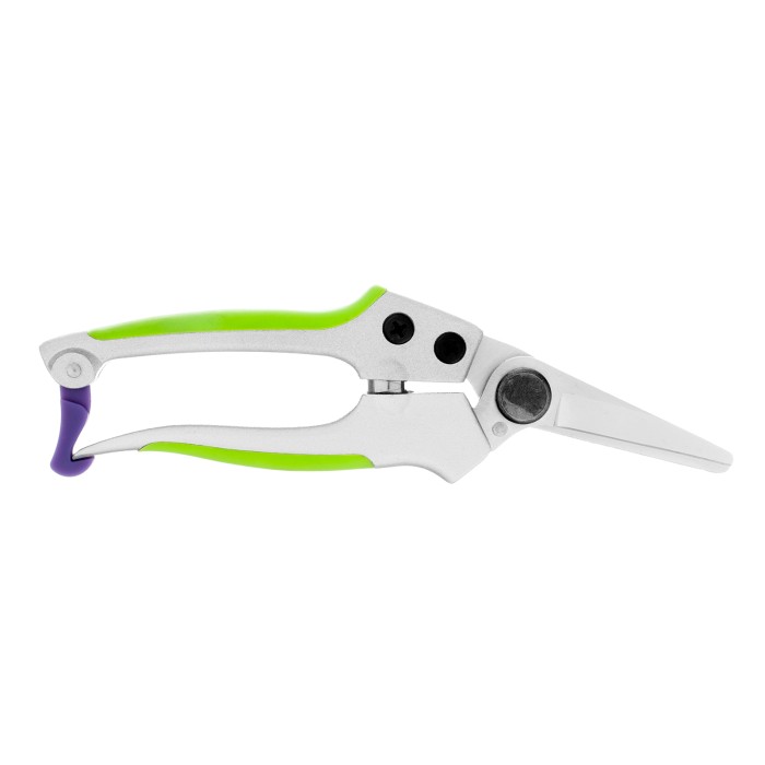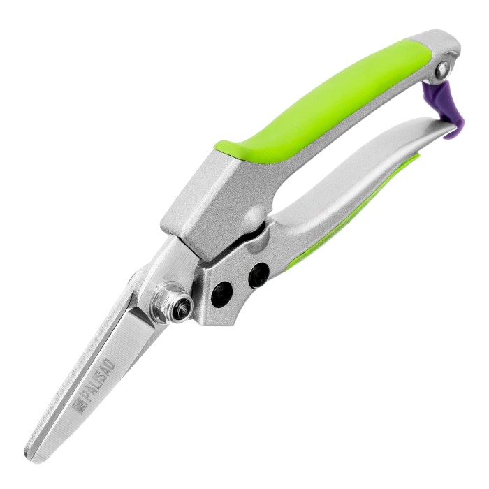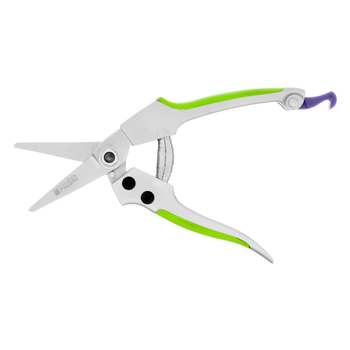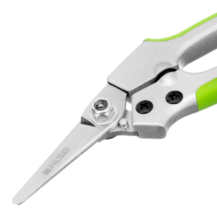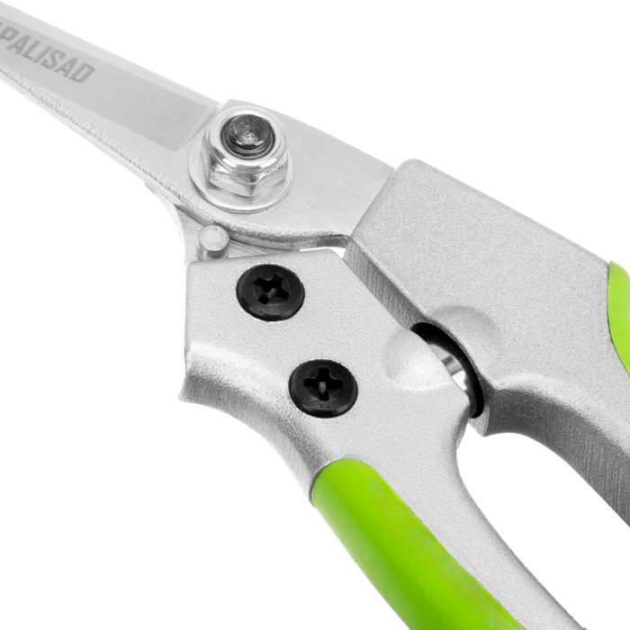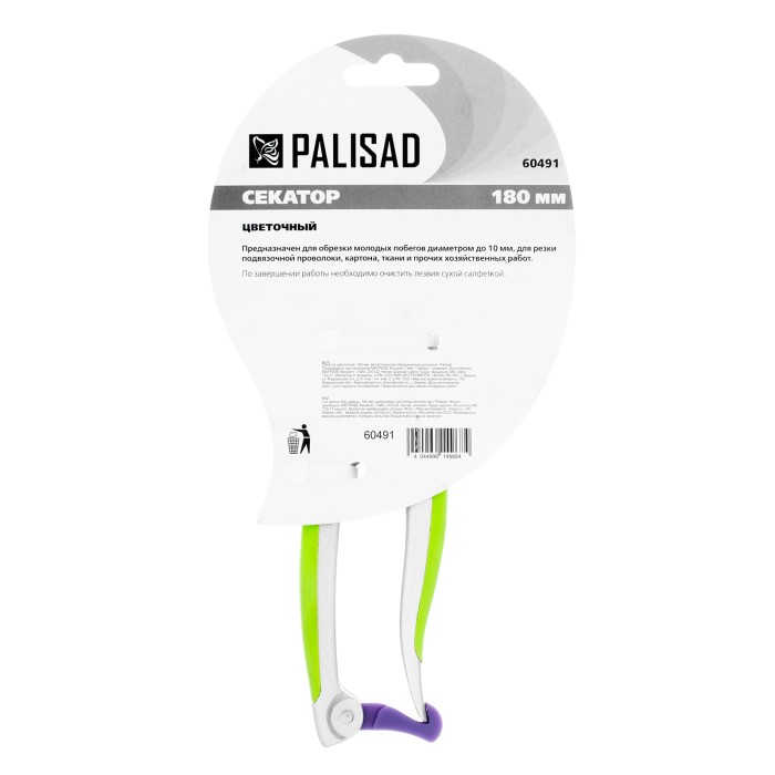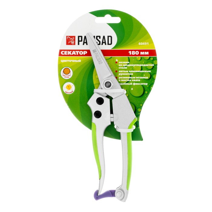 Цветочный секатор Palisad 60491 длиной 180 мм, с металлическими обрезиненными рукоятками, будет полезен дома, на даче, в саду и огороде. При помощи расположенных в параллельных плоскостях лезвий быстро и аккуратно срезает молодые побеги и стебли толщиной до 10 мм. Подходит для оформления крон бонсай и создания топиариев. Пригодится также в домашнем хозяйстве — им удобно резать картон, бумагу, ткань, подвязочный материал. Режущие кромки с прецизионной заточкой обеспечивают легкость реза, плотность смыкания лезвий регулируется при помощи крепежного винта.ПреимуществаПрочность и износостойкость — лезвия из высокоуглеродистой стали, прошедшие индукционную закалку, устойчивы к истиранию.Долговечность — хромированные рабочие поверхности защищены от коррозии.Надежность — литые алюминиевые рукоятки выдерживают значительные нагрузки.Безопасное хранение и транспортировка — фиксатор надежно удерживает лезвия в нерабочем положении.Комфортное использование — рукоятки со вставками из термопластичной резины удобно ложатся в руку.