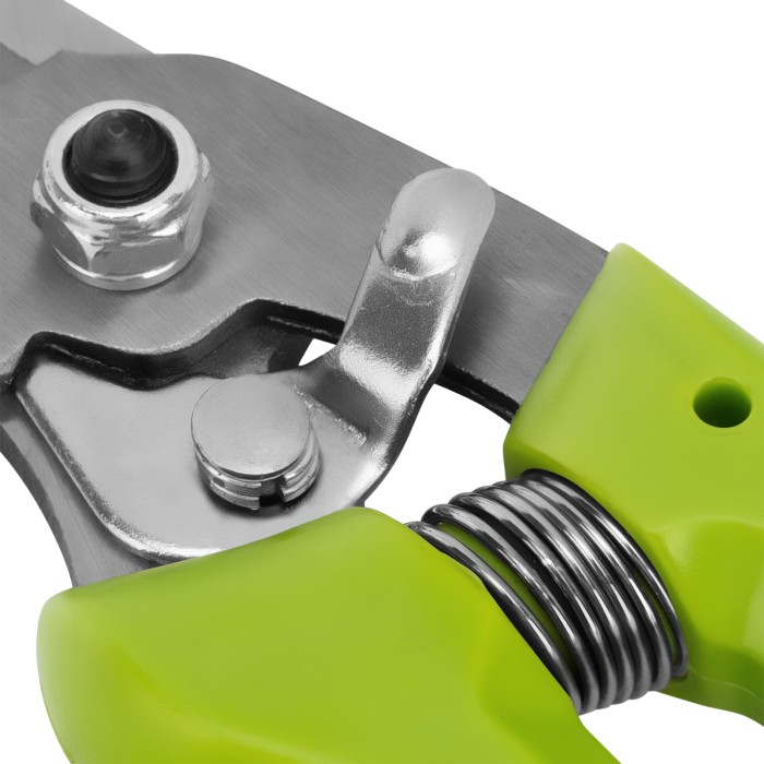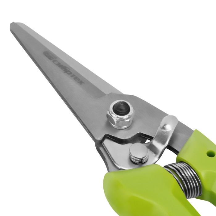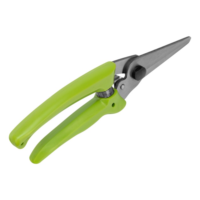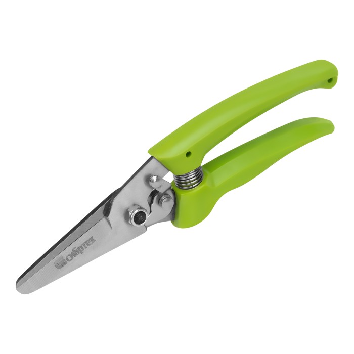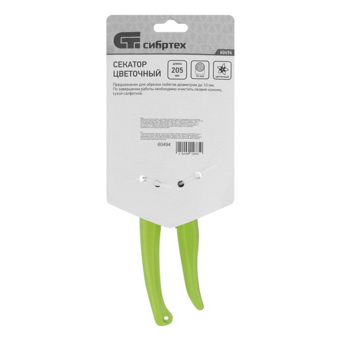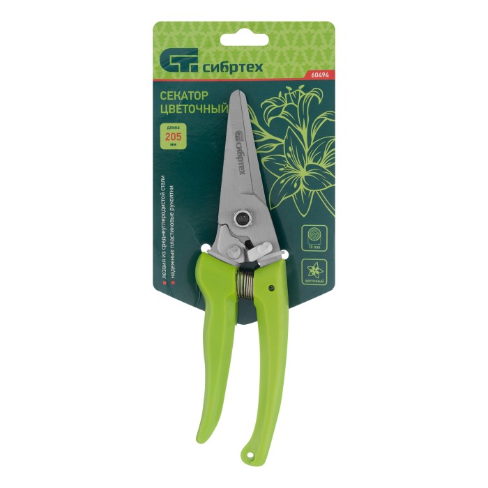 Цветочный секатор Сибртех 60494 длиной 205 мм, с пластиковыми рукоятками, — садовый инвентарь для обрезки молодых побегов и стеблей толщиной до 10 мм. Используется для ухода за растениями на даче, в саду и огороде, пригодится также в домашнем хозяйстве для разрезания картона, бумаги, ткани, подвязочного материала. Лезвия, движущиеся в параллельных плоскостях, производят чистый и ровный срез. Плотность смыкания лезвий можно изменить при помощи регулировочного винта.ПреимуществаНадежность — лезвия изготовлены из среднеуглеродистой стали, поэтому инструмент подходит для регулярного использования.Высокий ресурс — благодаря индукционной закалке и прецизионной заточке режущие кромки долго сохраняют остроту.Защита от разрушения — рабочие части покрыты антикоррозионным маслом, рукоятки из полипропилена устойчивы к воздействию ультрафиолета,Удобное хранение и транспортировка — надежный фиксатор лезвий препятствует их самопроизвольному раскрытию.