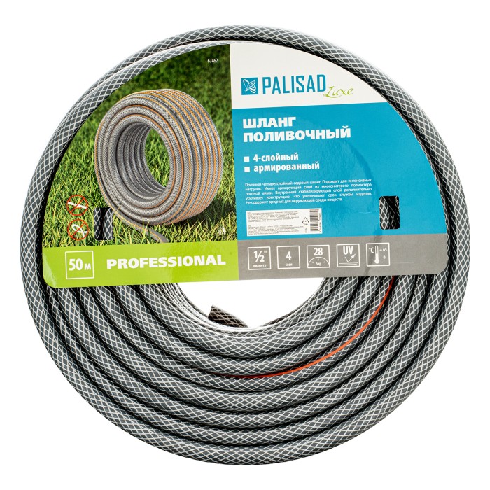 4-слойный армированный поливочный шланг Palisad LUXE «Professional» 67462 длиной 50 м и диаметром 1/2" используется для организации системы полива на даче, в саду, скверах и небольших парках. С его помощью удобно проводить ежедневное орошение газонов и растений. Гибкий напорный шланг оптимально подходит для интенсивной эксплуатации.ПреимуществаВысокий ресурс — шланг выполнен из поливинилхлорида (ПВХ) наивысшего качества и армирован.Максимально прочный армирующий слой — полиэстерная нить с инновационным плетением обеспечивает стойкость к высоким нагрузкам, перегибам и скручиванию.Защита от внешних воздействий — специальное покрытие предотвращает разрушение шланга от перепадов температур и УФ-лучей.Повышенная прочность — за счет толщины стенок 2,2 мм шланг выдерживает давление до 35 бар.Универсальность — изделие совместимо со всеми поливочными системами Palisad и Palisad LUXE.