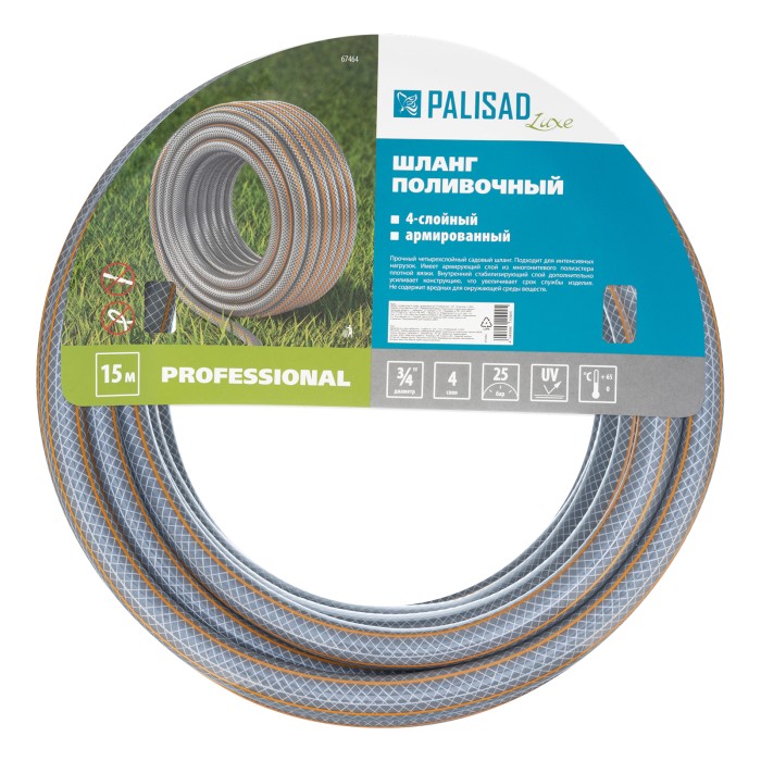 4-слойный армированный поливочный шланг Palisad LUXE «Professional» 67464 длиной 15 м и диаметром 3/4" используется для организации системы полива на даче, в саду, скверах и небольших парках. С его помощью удобно проводить ежедневное орошение газонов и растений. Гибкий напорный шланг оптимально подходит для интенсивной эксплуатации.ПреимуществаВысокий ресурс — шланг выполнен из поливинилхлорида (ПВХ) наивысшего качества и армирован.Максимально прочный армирующий слой — полиэстерная нить с инновационным плетением обеспечивает стойкость к высоким нагрузкам, перегибам и скручиванию.Защита от внешних воздействий — специальное покрытие предотвращает разрушение шланга от перепадов температур и УФ-лучей.Повышенная прочность — за счет толщины стенок 2,4 мм шланг выдерживает давление до 35 бар.Универсальность — изделие совместимо со всеми поливочными системами Palisad и Palisad LUXE.