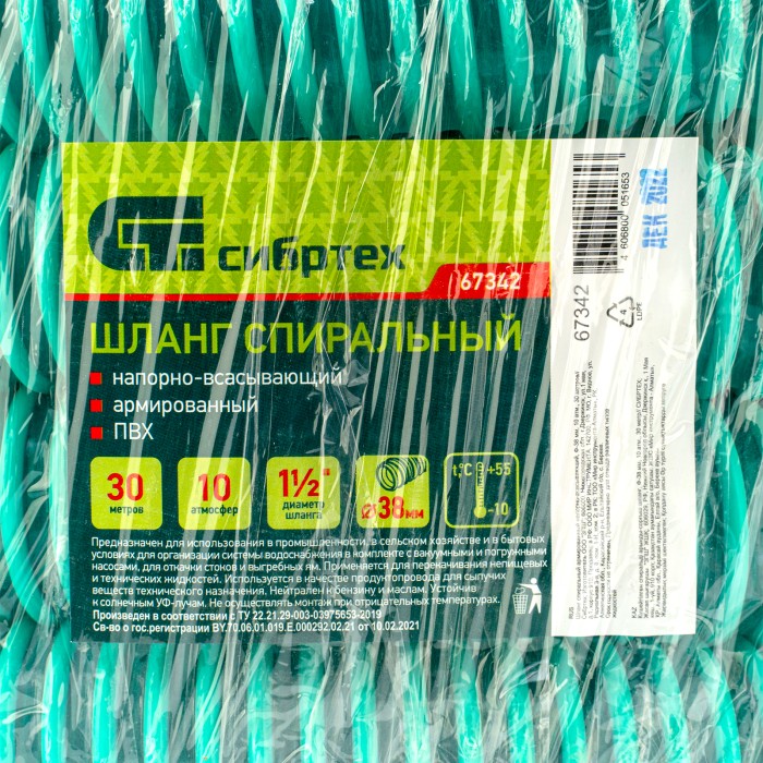 Спиральный армированный напорно-всасывающий шланг Сибртех 67342 длиной 30 метров и диаметром 38 мм выдерживает давление до 10 атмосфер и может применяться в промышленности, частном хозяйстве и на даче. Используется с пог...