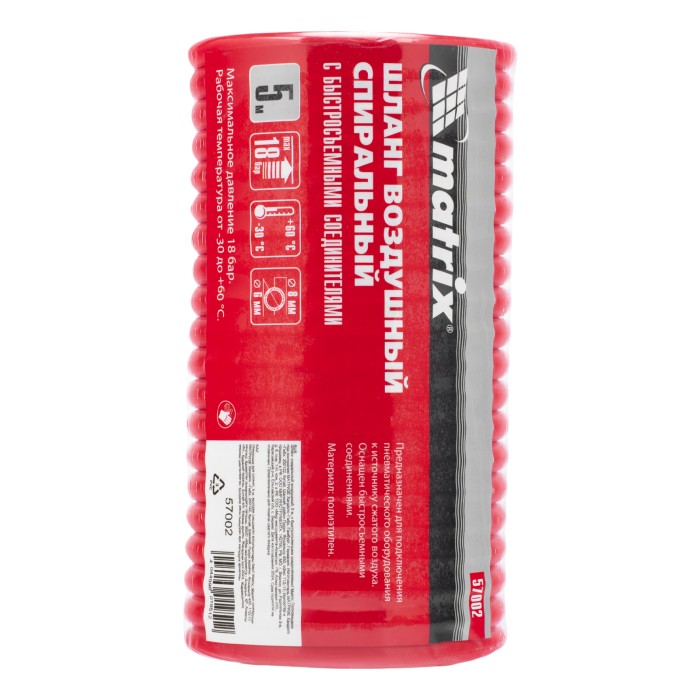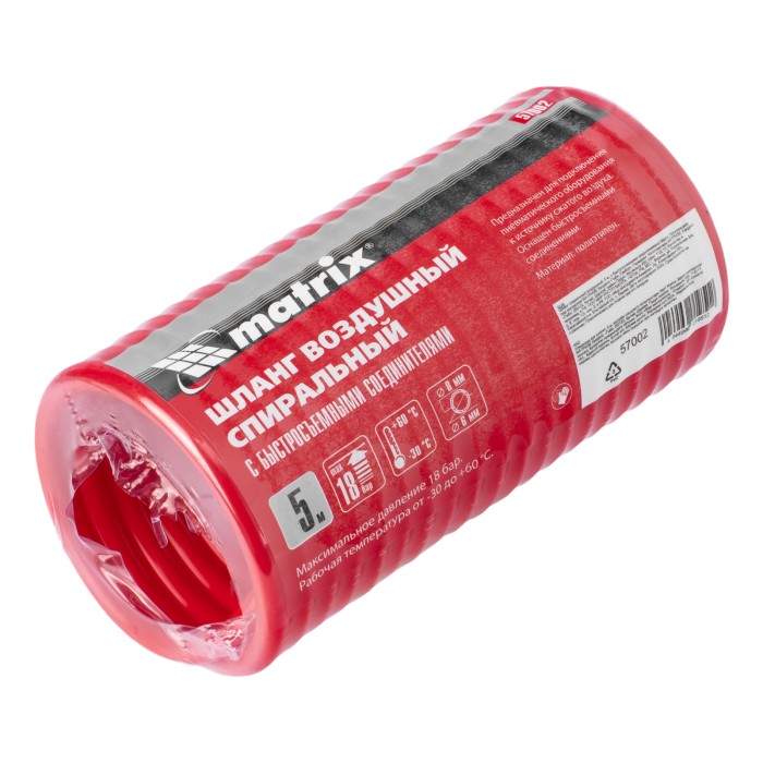 Спиральный воздушный шланг Matrix 57002 длиной 5 м, с быстросъемными соединениями, используется для подключения пневмоинструментов к компрессору. Изготовлен из легкого полиэтилена, за счет чего даже длительная работа не вызывает усталости. Имеет форму спирали, поэтому его не нужно скручивать после работы. Рукав пригодится в автосервисе, слесарной мастерской, а также во время отделочных работ.ПреимуществаБыстроразъемное соединение ускоряет подключение пневмоинструментов, что экономит время и силы мастера.Максимальное давление составляет 18 бар, что позволяет использовать шланг с мощным компрессорным оборудованием.Соединители имеют антикоррозийное покрытие, поэтому не ржавеют и служат долго.Увеличенная толщина шланга повышает сопротивляемость нагрузкам, устойчивость к высокому давлению и механическим воздействиям.