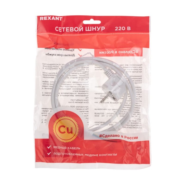 Электрический шнур предназначен для подключения бытовых приборов и осветительной техники к сети. Используется при ремонте или замене штатного шнура питания.Жилы изготовлены из меди, что обеспечивает высокую токопроводимость.Заземление обеспечивает защиту от электрического замыкания и повышает безопасность использования.Литая неразборная вилка евростандарта гарантирует стабильное подключение и надежную фиксацию в розетке. Угловая форма вилки облегчает подключение в ограниченном пространстве и уменьшает износ кабеля.Шнур имеет зачищенные контакты, что экономит время и упрощает процесс подключения.