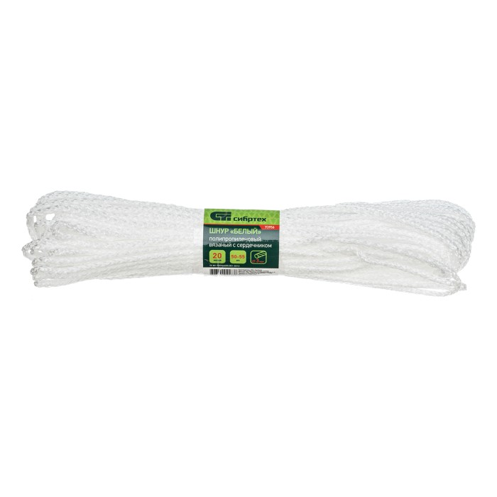 Вязаный полипропиленовый шнур с сердечником Сибртех 93956 белого цвета, диаметром 3 мм, длиной 20 м, будет полезен для хозяйственных нужд: сушки белья, связывания предметов, подвязки растений. Пригодится также в походе, ...