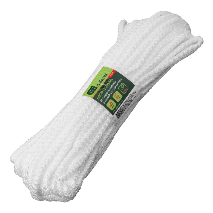Вязаный полипропиленовый шнур с сердечником Сибртех 93959 белого цвета, диаметром 6 мм, длиной 20 м, будет полезен для хозяйственных нужд: сушки белья, связывания предметов, подвязки растений. Пригодится также в походе, на охоте или рыбалке. Благодаря сердечнику и высокопрочной оплетке обладает повышенной устойчивостью к истиранию и разрыву — максимальная разрывная нагрузка составляет 95 кгс. Шнур выдерживает значительный вес, не растягивается и не провисает.ПреимуществаУдобное использование — мягкий и эластичный шнур легко завязывается и образует надежные узлы.Долговечность — полипропилен не гниет, т.к. практически не впитывает влагу, выдерживает многократные изгибания и подходит для длительного использования.Неприхотливость — хозяйственный шнур устойчив к воздействию химических веществ и перепадам температур, может использоваться вне помещения.Длина 20 м — шнур можно протянуть на большое расстояние или обвязать им габаритные предметы.