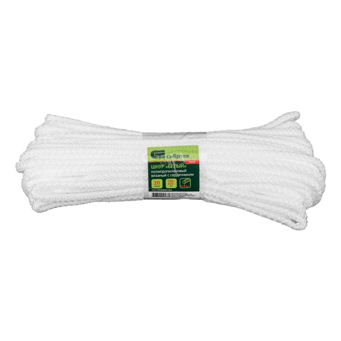 Шнур вязаный полипропиленовый с серд. белый, 6 мм, L 20 м, Сибртех