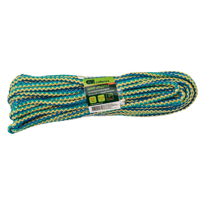 Вязаный полипропиленовый шнур с сердечником Сибртех «Радуга» 93954 белого цвета, диаметром 6 мм, длиной 20 м, будет полезен для хозяйственных нужд: сушки белья, связывания предметов, подвязки растений. Пригодится также в походе, на охоте или рыбалке. Благодаря сердечнику и высокопрочной оплетке обладает повышенной устойчивостью к истиранию и разрыву — максимальная разрывная нагрузка составляет 90 кгс. Шнур выдерживает значительный вес, не растягивается и не провисает.ПреимуществаУдобное использование — мягкий и эластичный шнур легко завязывается и образует надежные узлы.Долговечность — полипропилен не гниет, т.к. практически не впитывает влагу, выдерживает многократные изгибания и подходит для длительного использования.Неприхотливость — хозяйственный шнур устойчив к воздействию химических веществ и перепадам температур, может использоваться вне помещения.Длина 20 м — шнур можно протянуть на большое расстояние или обвязать им габаритные предметы.