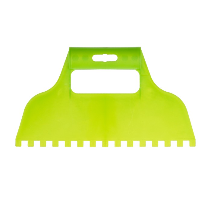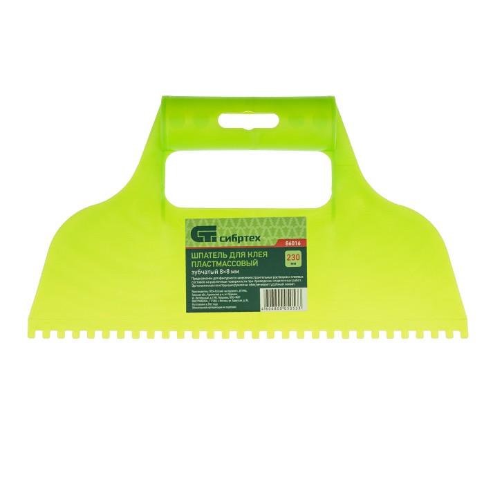 Пластмассовый шпатель для клея Сибртех 86016, зубчатый (квадратные зубья 8 х 8 мм), рассчитан на нанесение клеевых составов и их последующее выравнивание. Зубчатая рабочая часть позволяет равномерно наносить смесь для надежного соединения с плиткой и расходовать ее экономно.ПреимуществаЭргономичная рукоятка способствует удобному захвату инструмента и комфортной работе.В рукоятке предусмотрено отверстие для подвесного хранения шпателя.Небольшой вес инструмента предотвращает появление усталости в руках во время работы.