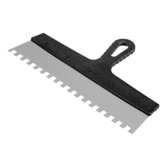 Шпатель Сибртех 85507 из нержавеющей стали, шириной 350 мм, с пластмассовой рукояткой и зубьями 10 х 10 мм, применяется во время проведения работ по укладке плитки, мозаики и т. д. Квадратные зубья облегчают нанесение кл...