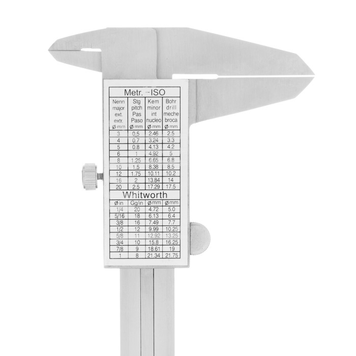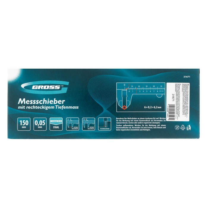 Штангенциркуль Gross 31671 из нержавеющей стали, с глубиномером, предназначен для измерения внутренних и наружных размеров деталей и заготовок в диапазоне 0-150 мм. Значение отсчета по нониусу составляет 0,05 мм. Погрешность находится в пределах ±0,02 мм при измерении до 100 мм, и ±0,03 мм — свыше 100 мм. Инструмент имеет губки двух видов для облегчения замеров внутри и снаружи предметов. Штангенциркуль будет полезен на производственном предприятии, в слесарной и столярной мастерской, автосервисе, а также пригодится в быту.ПреимуществаДолговечность — штангенциркуль выполнен из прочной нержавеющей стали, устойчивой к коррозии.Высокая точность измерений — стопорный винт предотвращает смещение подвижной рамки прибора.Комфортное считывание результатов — шкала штангенциркуля выражена в миллиметрах и дюймах.Дополнительные возможности — благодаря линейке глубиномера штангенциркуль может использоваться для определения глубины отверстий. Удобное хранение и транспортировка — инструмент поставляется в прочном кейсе из ABS-пластика с ложементом.