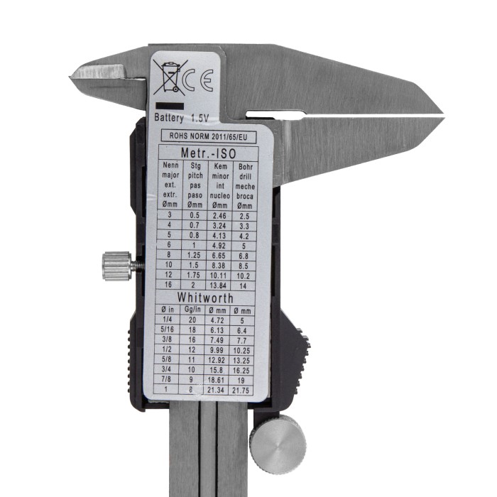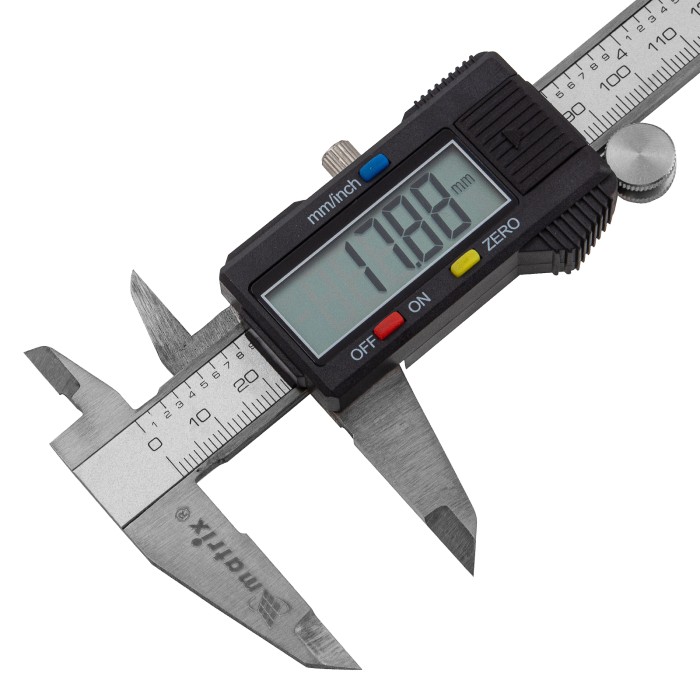 Электронный штангенциркуль Matrix 31611 со шкалой 150 мм предназначен для определения внутренних и наружных размеров различных предметов, а также глубин отверстий и канавок — для этого предусмотрен глубиномер. Цифровой инструмент позволяет проводить точные замеры, т.к. его погрешность составляет ±0,02 мм при измерении размеров до 100 мм, и ±0,03 мм — свыше 100 мм. Результаты отображаются на жидкокристаллическом дисплее, поэтому считывание показаний происходит легко и быстро. Штангенциркуль пригодится на производстве, в слесарной и столярной мастерской, а также дома или в гараже.ПреимуществаПрочность и устойчивость к коррозии — штангенциркуль изготовлен из инструментальной нержавеющей стали.Быстрое восстановление работоспособности — батарею типа SR44 1,5 В, от которой питается инструмент, легко заменить.Надежная упаковка — плотно закрывающийся пластмассовый футляр с мягкой подложкой предотвращает поломку инструмента в результате случайного падения или удара.