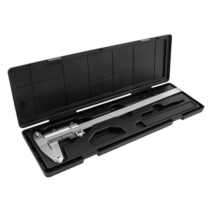 Металлический штангенциркуль с глубиномером Matrix 316345, 300 мм, со значением отсчета по нониусу 0,02 мм, используется для быстрого определения размеров внутри и снаружи деталей, а также глубин отверстий и канавок — для этого предусмотрен глубиномер. Погрешность составляет ±0,02 мм при измерении размеров до 100 мм, и ±0,03 мм — свыше 100 мм. Измерительный инструмент используется в токарном, слесарном деле, будет полезен на производственном предприятии, а также дома или в гараже.ПреимуществаНадежность — штангенциркуль изготовлен из углеродистой стали, устойчивой к механическим воздействиям.Точное позиционирование губок — зажимной винт позволяет зафиксировать подвижную рамку, чтобы она не сместилась во время измерения.Удобное хранение и транспортировка — штангенциркуль упакован в прочный пластиковый кейс.