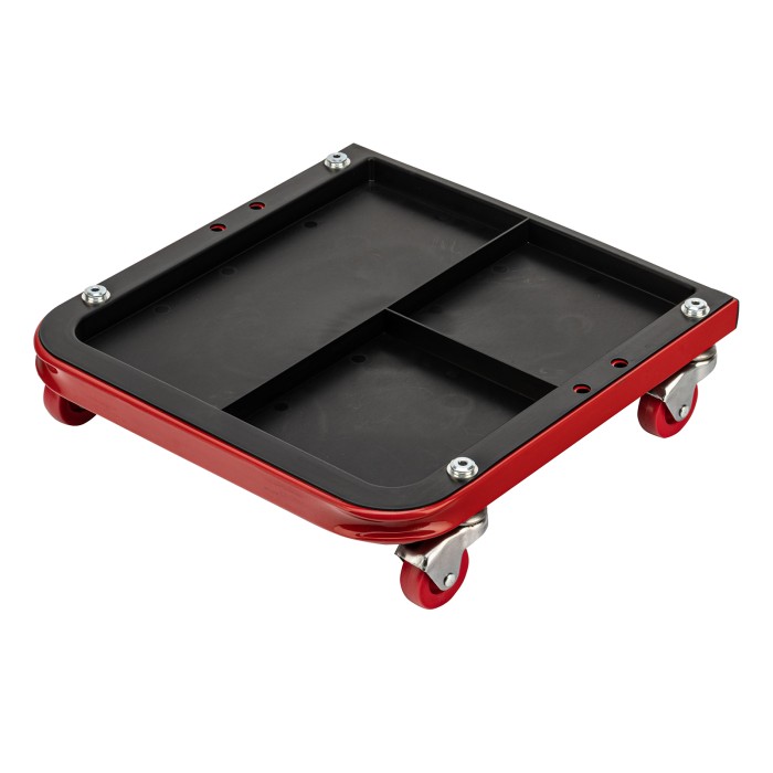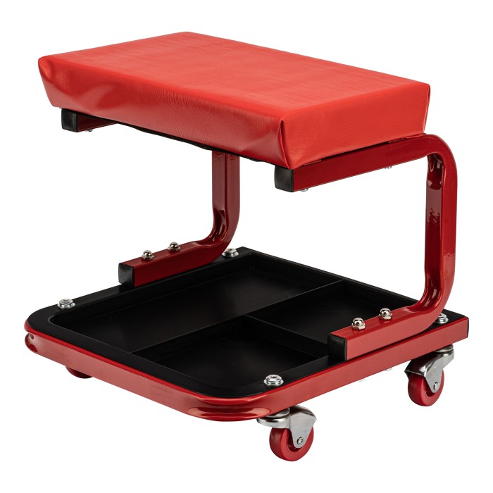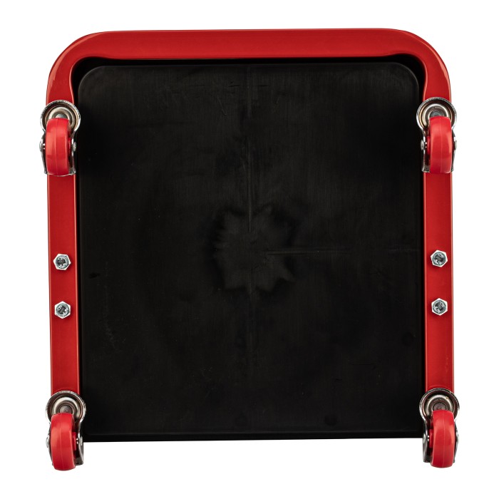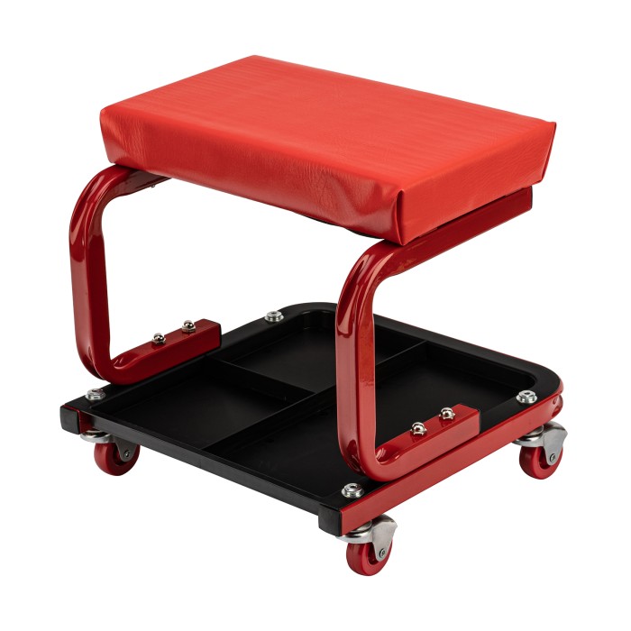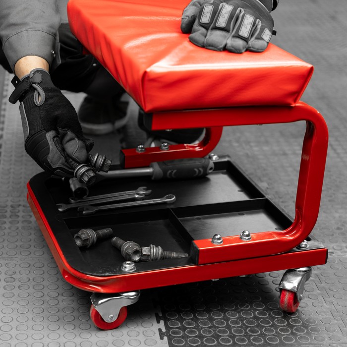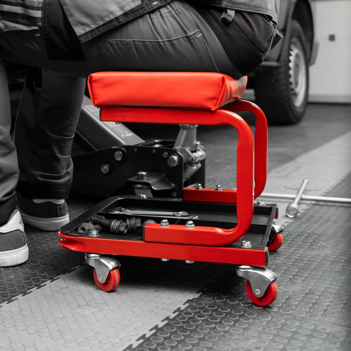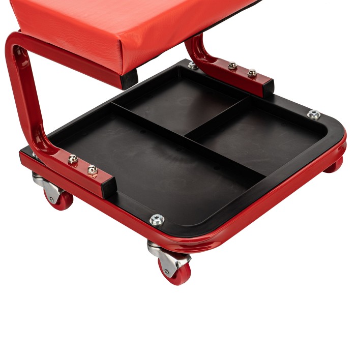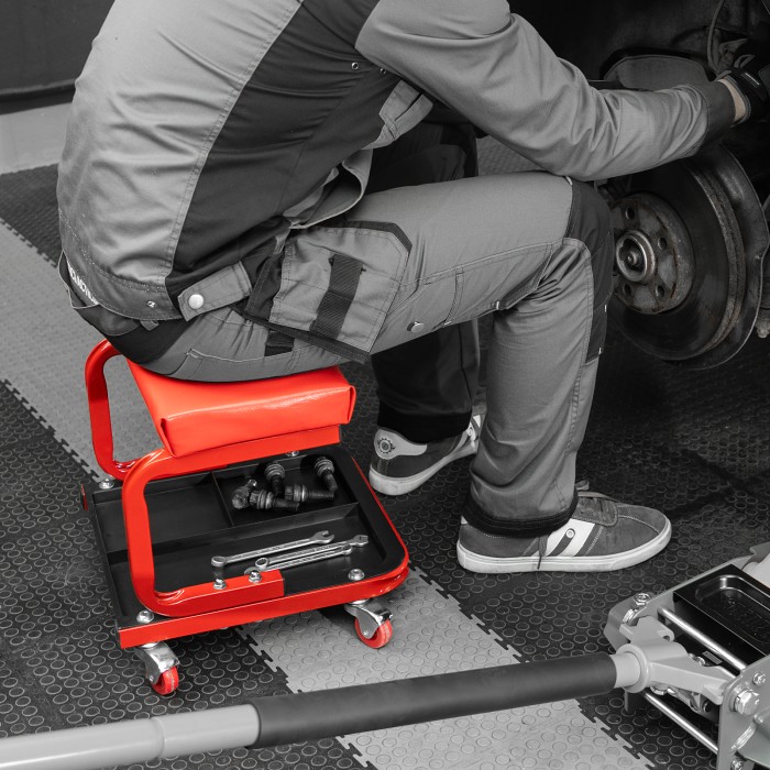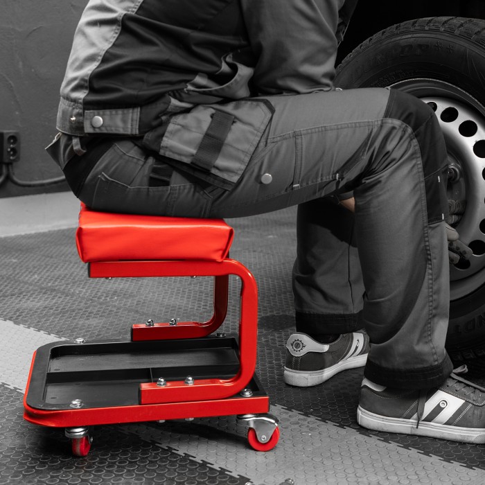 Сиденье Matrix 567035 размером 360 х 355 х 380 мм пригодится профессионалам на станциях техобслуживания и частным мастерам в гараже. С его помощью удобно осуществлять ремонт транспортного средства, также сиденье можно использовать в качестве гаражной мебели для отдыха. Прочный стальной корпус обеспечивает надежность конструкции и способность выдерживать нагрузки до 110 кг.ПреимуществаСидушка обшита специальным материалом, устойчивым к воздействию масел и бензина, поэтому прослужит долго.На мягкой сидушке, набитой поролоном, комфортно сидеть.На сиденье предусмотрены 4 колеса с углом поворота на 360°, поэтому можно с удобством перемещаться по гаражу.Для удобства хранения инструментов и деталей в конструкции предусмотрен специальный поддон с 3 секциями.