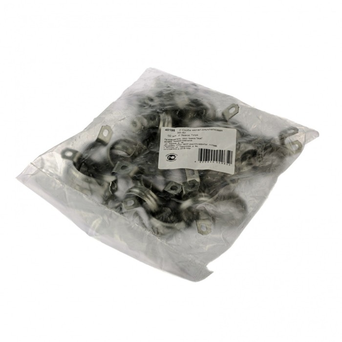 Двухлапковая металлическая скоба (СМД) Сибртех 48195 диаметром 38 мм, 50 шт. в комплекте, используется для крепления труб, проводов и шлангов на различных строительных конструкциях, имеющих 2 параллельных ряда крепежных ...