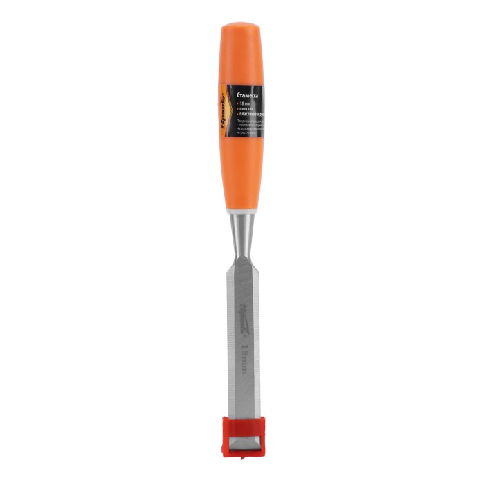 Плоская стамеска Sparta 244205 с шириной лопасти 18 мм и пластиковой рукояткой предназначена для тонких работ по дереву. Позволяет зачищать пазы и кромки, снимать фаски, вырезать небольшие прямоугольные углубления. Стамеска применяется в столярном деле, мебельном производстве, а также будет полезна в быту.ПреимуществаПрочность — полотно выполнено из качественной конструкционной углеродистой стали 55.Высокая режущая способность — твердость стамески составляет 50-55 HRC на длине 2/3 рабочей части полотна, лезвие заточено на специальном оборудовании под углом 20-35°.Быстрый поиск — благодаря яркому цвету рукоятки стамеска хорошо заметна среди других инструментов.Комфортная работа — прочную пластмассовую рукоятку удобно держать в руке.