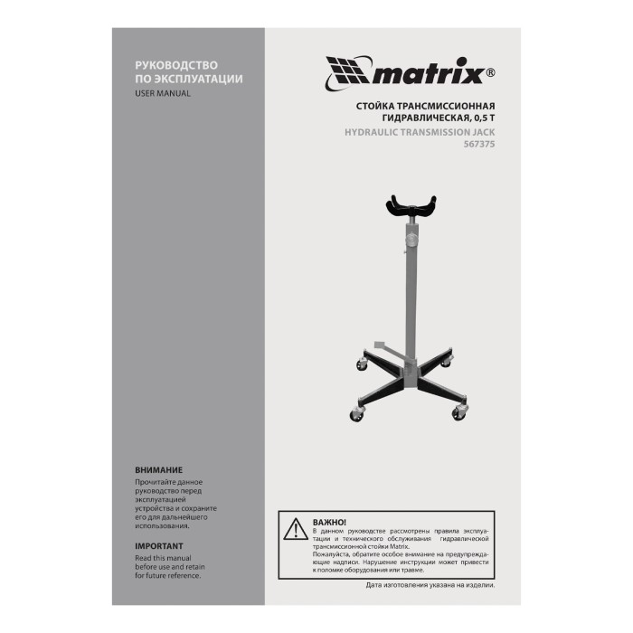 Стойка трансмиссионная гидравлическая, 0.5 т, H подъема 1130-1945 мм Matrix