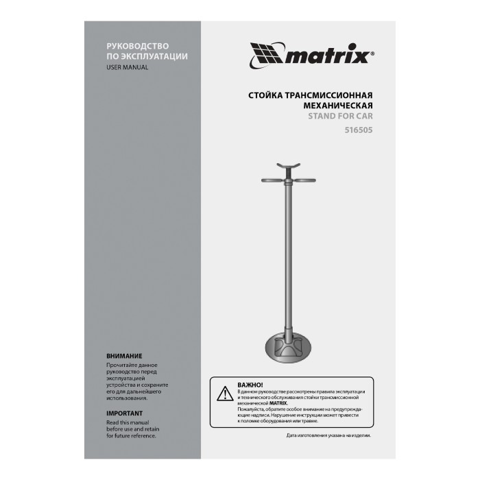 Трансмиссионная механическая стойка Matrix High Position 516505 предназначена для подхвата и фиксации грузов массой до 0,6 т на высоте 1360-2030 мм с целью проведения ремонтных работ, установки или демонтажа элементов тр...
