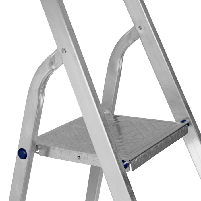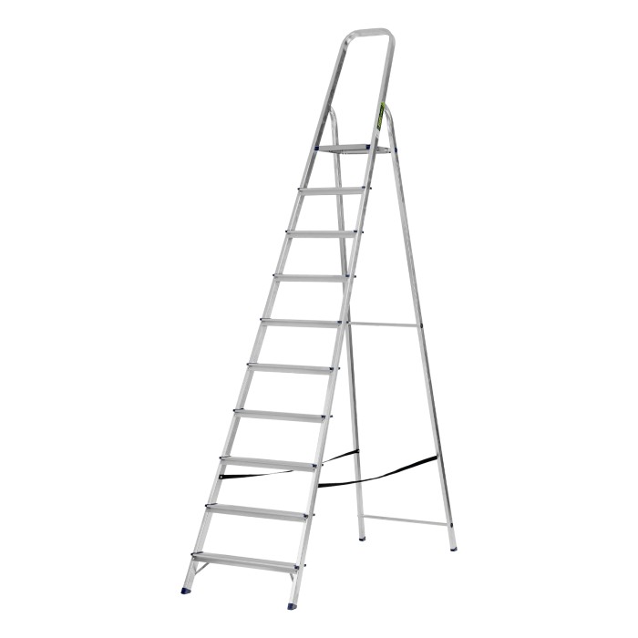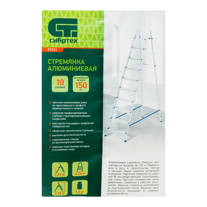 Стремянка алюминиевая Сибртех 97721 с 10 ступенями предназначена для выполнения работ на высоте, превышающей человеческий рост. Высокая дуга безопасности обеспечивает устойчивое положение пользователя. Площадка находится на высоте 208,1 см от опорной поверхности, рабочая высота стремянки составляет 408,1 см (при среднем росте пользователя 170 см). Стремянка пригодится во время строительных и ремонтных работ, будет полезна на даче или в гараже.Стремянка устанавливается на плоскую поверхность и не предназначена для работы с электроинструментом.ПреимуществаПродуманная конструкция — стальная рабочая площадка с зацепами надежно фиксирует стремянку в разложенном положении.Надежность — рама из прямоугольного алюминиевого профиля выдерживает нагрузку до 150 кг, широкие ступени закреплены заклепками, страховочные стяжки повышают прочность конструкции.Безопасность пользователя — рифленая поверхность ступеней предотвращает скольжение, пластиковые накладки на углах снижают риск травмирования.Защита опорной поверхности от царапин — на ножках имеются пластиковые заглушки.Удобное хранение и транспортировка — габариты стремянки в сложенном виде 2923 х 585 х 115 мм.Внешний вид товара может незначительно отличаться от указанного на изображении, что не влечет изменения его качества.