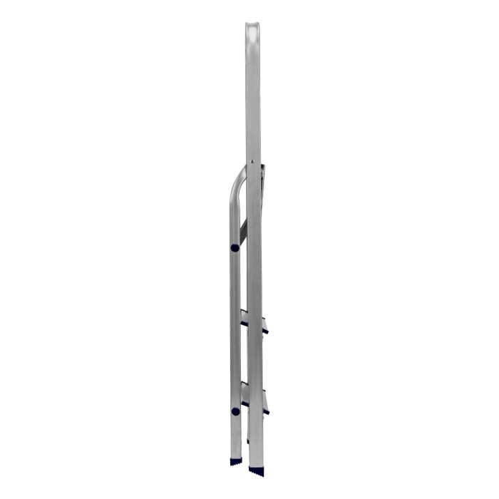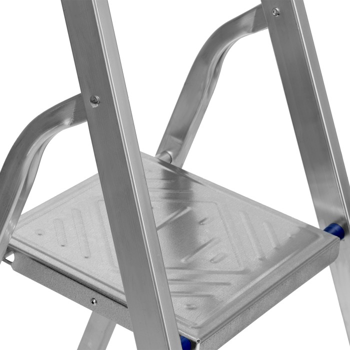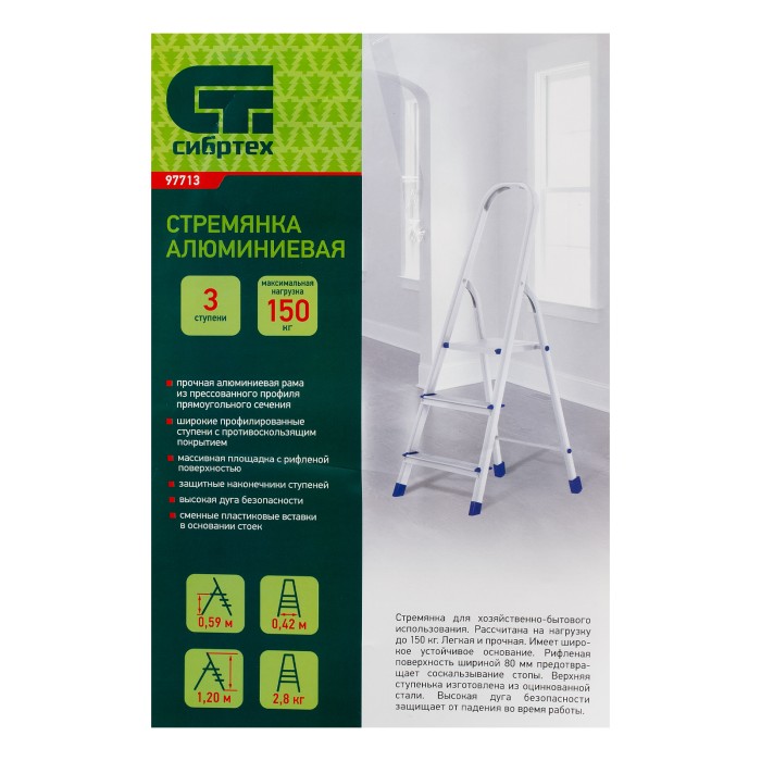 Стремянка алюминиевая Сибртех 97713 с 3 ступенями предназначена для выполнения работ на высоте, превышающей человеческий рост. Высокая дуга безопасности обеспечивает устойчивое положение пользователя. Площадка находится на высоте 59,7 см от опорной поверхности, рабочая высота стремянки составляет 259,7 см (при среднем росте пользователя 170 см). Стремянка пригодится во время строительных и ремонтных работ, позволит без лишних усилий повесить картину или шторы, покрасить стену, достать нужную вещь с антресолей или верхней полки шкафа, а также решить много других бытовых задач.Стремянка устанавливается на плоскую поверхность и не предназначена для работы с электроинструментом.ПреимуществаПродуманная конструкция — стальная рабочая площадка с зацепами надежно фиксирует стремянку в разложенном положении.Надежность — рама из прямоугольного алюминиевого профиля выдерживает нагрузку до 150 кг, широкие ступени закреплены заклепками.Безопасность пользователя — рифленая поверхность ступеней предотвращает скольжение, пластиковые накладки на углах снижают риск травмирования.Защита опорной поверхности от царапин — на ножках имеются пластиковые заглушки.Вес 2,7 кг — со стремянкой без труда справится пользователь с любым уровнем подготовки.Компактность — габариты стремянки в сложенном состоянии составляют 1313 х 416 х 112 мм, поэтому ее удобно хранить и транспортировать.Внешний вид товара может незначительно отличаться от указанного на изображении, что не влечет изменения его качества.
