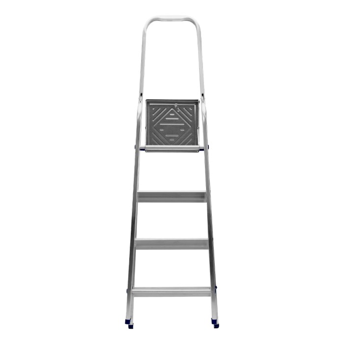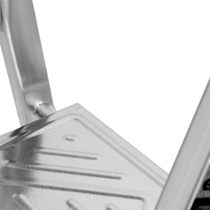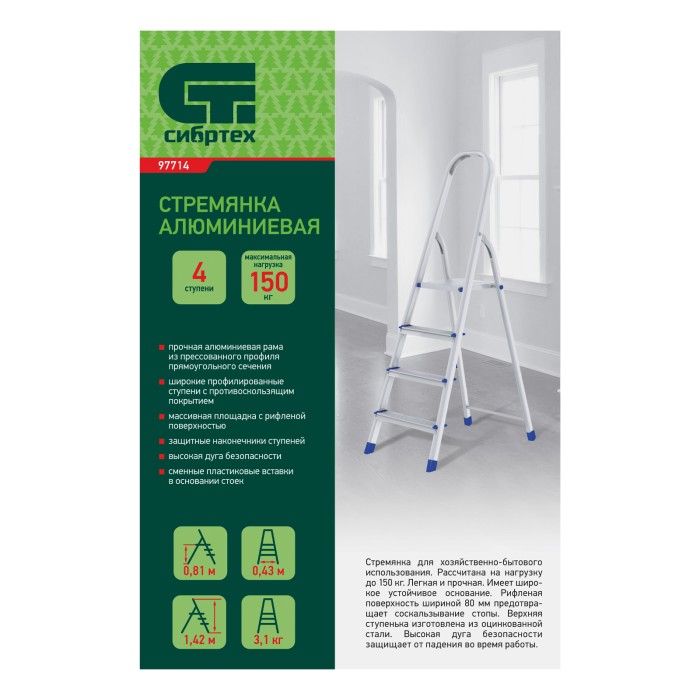 Стремянка алюминиевая Сибртех 97714 с 4 ступенями предназначена для выполнения работ на высоте, превышающей человеческий рост. Высокая дуга безопасности обеспечивает устойчивое положение пользователя. Площадка находится на высоте 80,9 см от опорной поверхности, рабочая высота стремянки составляет 280,9 см (при среднем росте пользователя 170 см). Стремянка пригодится во время строительных и ремонтных работ, позволит без лишних усилий повесить картину или шторы, покрасить стену, достать нужную вещь с антресолей или верхней полки шкафа, а также решить много других бытовых задач.Стремянка устанавливается на плоскую поверхность и не предназначена для работы с электроинструментом.ПреимуществаПродуманная конструкция — стальная рабочая площадка с зацепами надежно фиксирует стремянку в разложенном положении.Надежность — рама из прямоугольного алюминиевого профиля выдерживает нагрузку до 150 кг, широкие ступени закреплены заклепками.Безопасность пользователя — рифленая поверхность ступеней предотвращает скольжение, пластиковые накладки на углах снижают риск травмирования.Защита опорной поверхности от царапин — на ножках имеются пластиковые заглушки.Вес 3,2 кг — со стремянкой без труда справится пользователь с любым уровнем подготовки.Компактность — габариты стремянки в сложенном состоянии составляют 1543 х 440 х 112 мм, поэтому ее удобно хранить и транспортировать.Внешний вид товара может незначительно отличаться от указанного на изображении, что не влечет изменения его качества.