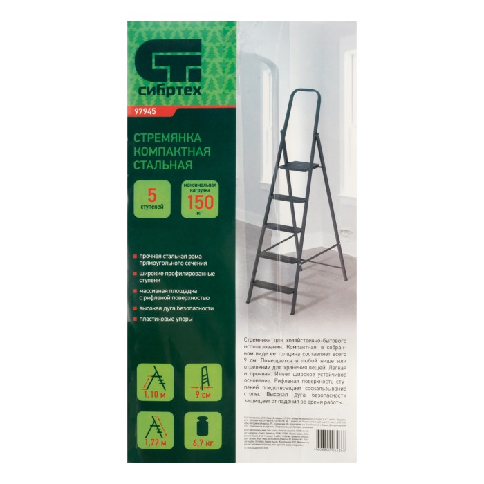 Стремянка компактная стальная Сибртех 97945 с 5 ступенями служит для проведения работ на высоте, превышающей человеческий рост. Стальные профилированные рама и ступени рассчитаны на нагрузку до 150 кг. Площадка находится на высоте 110 см от опорной поверхности, рабочая высота стремянки составляет 310 см (при среднем росте пользователя 170 см). Использовать стремянку можно дома, на даче или в гараже, а также во время строительства и ремонта.Поверхность для установки стремянки должна быть ровной, использование электроинструмента во время работы не допускается.ПреимуществаДолговечность — антрацитовое покрытие порошковой эмалью защищает стремянку от коррозии.Надежная фиксация в рабочем положении — на верхней площадке имеются специальные зацепы, опоры дополнительно удерживаются страховочными лентами.Безопасный подъем и спуск — рифленая поверхность ступеней обеспечивает хорошее сцепление с подошвами обуви.Отсутствие царапин на напольном покрытии — на ножках имеются пластиковые накладки.Комфортная работа — стремянка имеет широкие ступени и высокую дугу безопасности.Удобное хранение и транспортировка — стремянка весит 6,8 кг, ее размеры в сложенном состоянии составляют 1820 х 475 х 87 мм.
