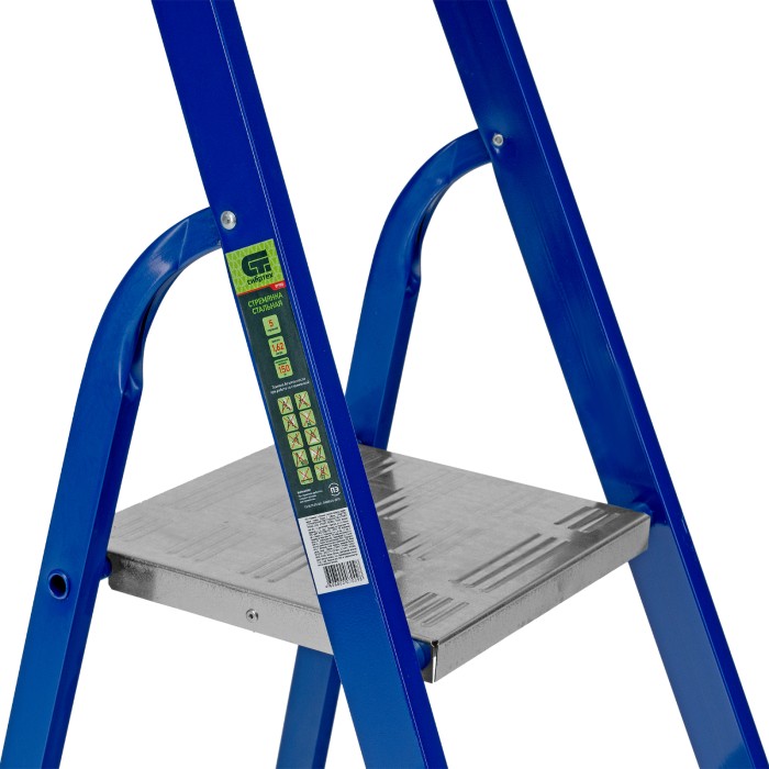 Стремянка Сибртех 97955 со стальным профилем и 5 ступенями, 4 из которых алюминиевые, упрощает доступ к предметам, расположенным на антресолях, шкафах, высоких полках. Также будет полезна для проведения отделочных и монтажных работ. Лестница обладает высокой прочностью при весе 6 кг и выдерживает нагрузку до 150 кг. Площадка находится на высоте 101,2 см от опорной поверхности, рабочая высота стремянки составляет 301,2 см (при среднем росте пользователя 170 см).Стремянку следует устанавливать на ровную поверхность, работать на ней с электроинструментом нельзя.ПреимуществаНадежность — рама изготовлена из профилированной стали, стальная верхняя площадка с зацепами прочно фиксирует стремянку в рабочем положении, страховочные ленты придают дополнительную прочность конструкции.Долговечность — покрытие из порошковой эмали антрацитового цвета защищает стальную поверхность от коррозии.Безопасность пользователя — на всех ступенях имеется рифление, пластиковые накладки по краям защищают от травм.Защита напольного покрытия — опоры с пластиковыми рифлеными наконечниками не скользят и не оставляют царапин.Комфортная работа — стремянка имеет широкие ступени и высокую дугу безопасности.Удобное хранение и транспортировка — размеры лестницы в сложенном состоянии 1720 х 460 х 112 мм.Внешний вид товара может незначительно отличаться от указанного на изображении, что не влечет изменения его качества.