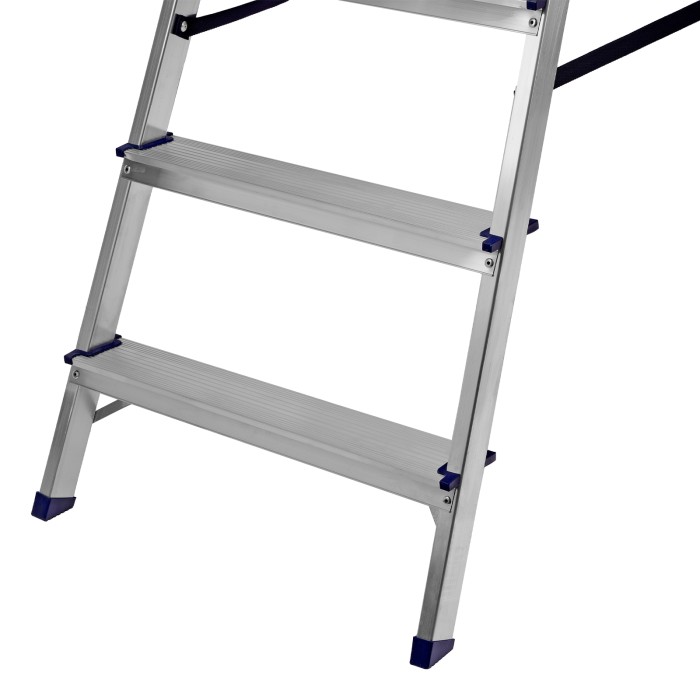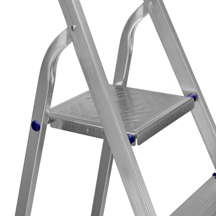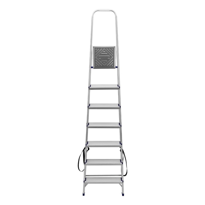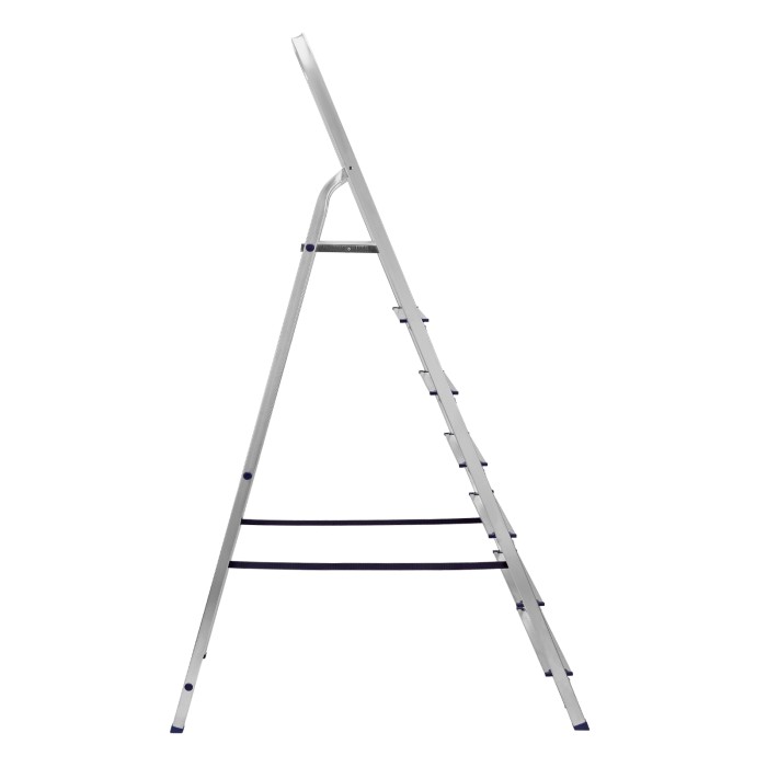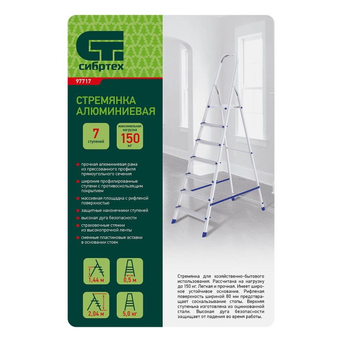 Стремянка алюминиевая Сибртех 97717 с 7 ступенями предназначена для выполнения работ на высоте, превышающей человеческий рост. Высокая дуга безопасности обеспечивает устойчивое положение пользователя. Площадка находится на высоте 144,5 см от опорной поверхности, рабочая высота стремянки составляет 344,5 см (при среднем росте пользователя 170 см). Стремянка пригодится во время строительных и ремонтных работ, позволит без лишних усилий повесить картину или шторы, покрасить стену, достать нужную вещь с антресолей или верхней полки шкафа, а также решить много других бытовых задач.Стремянка устанавливается на плоскую поверхность и не предназначена для работы с электроинструментом.ПреимуществаПродуманная конструкция — стальная рабочая площадка с зацепами надежно фиксирует стремянку в разложенном положении.Надежность — рама из прямоугольного алюминиевого профиля выдерживает нагрузку до 150 кг, широкие ступени закреплены заклепками, страховочные стяжки повышают прочность конструкции.Безопасность пользователя — рифленая поверхность ступеней предотвращает скольжение, пластиковые накладки на углах снижают риск травмирования.Защита опорной поверхности от царапин — на ножках имеются пластиковые заглушки.Удобное хранение и транспортировка — габариты стремянки в сложенном виде 2233 х 512 х 115 мм.Внешний вид товара может незначительно отличаться от указанного на изображении, что не влечет изменения его качества.