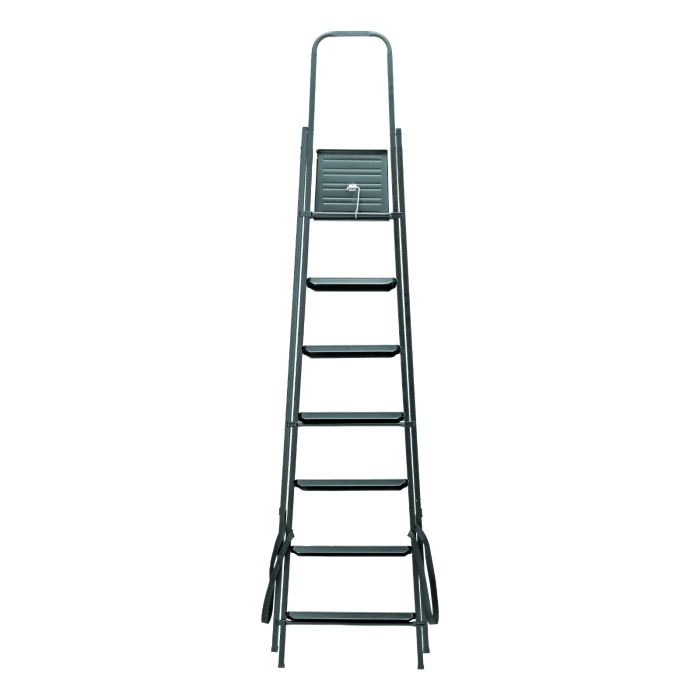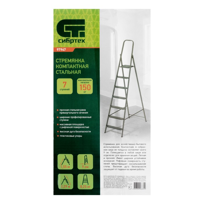 Стремянка компактная стальная Сибртех 97947 с 7 ступенями служит для проведения работ на высоте, превышающей человеческий рост. Стальные профилированные рама и ступени рассчитаны на нагрузку до 150 кг. Площадка находится на высоте 156 см от опорной поверхности, рабочая высота стремянки составляет 356 см (при среднем росте пользователя 170 см). Использовать стремянку можно дома, на даче или в гараже, а также во время строительства и ремонта.Поверхность для установки стремянки должна быть ровной, использование электроинструмента во время работы не допускается.ПреимуществаДолговечность — антрацитовое покрытие порошковой эмалью защищает стремянку от коррозии.Надежная фиксация в рабочем положении — на верхней площадке имеются специальные зацепы, опоры дополнительно удерживаются страховочными лентами.Безопасный подъем и спуск — рифленая поверхность ступеней обеспечивает хорошее сцепление с подошвами обуви.Отсутствие царапин на напольном покрытии — на ножках имеются пластиковые накладки.Комфортная работа — стремянка имеет широкие ступени и высокую дугу безопасности.Удобное хранение и транспортировка — стремянка весит 8,4 кг, ее размеры в сложенном состоянии составляют 2290 х 525 х 87 мм.