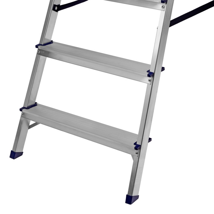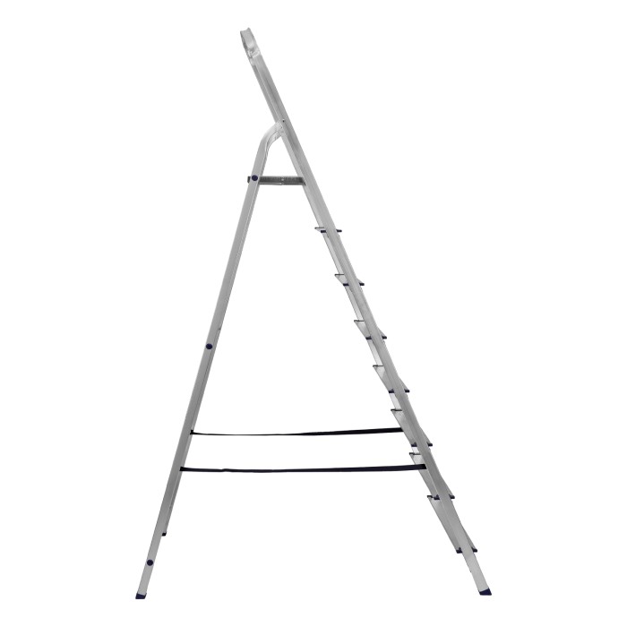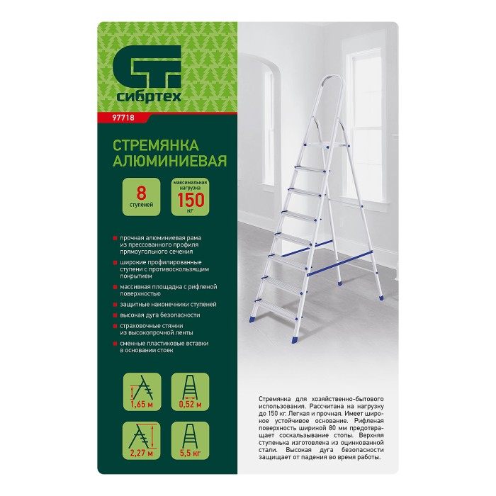 Стремянка алюминиевая Сибртех 97718 с 8 ступенями предназначена для выполнения работ на высоте, превышающей человеческий рост. Высокая дуга безопасности обеспечивает устойчивое положение пользователя. Площадка находится на высоте 165,7 см от опорной поверхности, рабочая высота стремянки составляет 365,7 см (при среднем росте пользователя 170 см). Стремянка пригодится во время строительных и ремонтных работ, будет полезна на даче или в гараже.Стремянка устанавливается на плоскую поверхность и не предназначена для работы с электроинструментом.ПреимуществаПродуманная конструкция — стальная рабочая площадка с зацепами надежно фиксирует стремянку в разложенном положении.Надежность — рама из прямоугольного алюминиевого профиля выдерживает нагрузку до 150 кг, широкие ступени закреплены заклепками, страховочные стяжки повышают прочность конструкции.Безопасность пользователя — рифленая поверхность ступеней предотвращает скольжение, пластиковые накладки на углах снижают риск травмирования.Защита опорной поверхности от царапин — на ножках имеются пластиковые заглушки.Удобное хранение и транспортировка — габариты стремянки в сложенном виде 2463 х 537 х 115 мм.Внешний вид товара может незначительно отличаться от указанного на изображении, что не влечет изменения его качества.