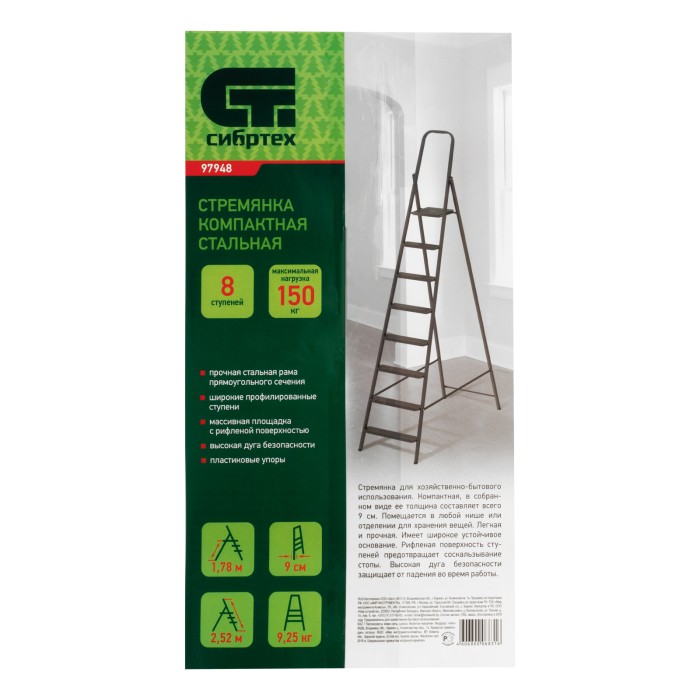 Стремянка компактная стальная Сибртех 97948 с 8 ступенями служит для проведения работ на высоте, превышающей человеческий рост. Стальные профилированные рама и ступени рассчитаны на нагрузку до 150 кг. Площадка находится на высоте 179 см от опорной поверхности, рабочая высота стремянки составляет 379 см (при среднем росте пользователя 170 см). Использовать стремянку можно дома, на даче или в гараже, а также во время строительства и ремонта.Поверхность для установки стремянки должна быть ровной, использование электроинструмента во время работы не допускается.ПреимуществаДолговечность — антрацитовое покрытие порошковой эмалью защищает стремянку от коррозии.Надежная фиксация в рабочем положении — на верхней площадке имеются специальные зацепы, опоры дополнительно удерживаются страховочными лентами.Безопасный подъем и спуск — рифленая поверхность ступеней обеспечивает хорошее сцепление с подошвами обуви.Отсутствие царапин на напольном покрытии — на ножках имеются пластиковые накладки.Комфортная работа — стремянка имеет широкие ступени и высокую дугу безопасности.Удобное хранение и транспортировка — стремянка весит 9,5 кг, ее размеры в сложенном состоянии составляют 2520 х 550 х 87 мм.