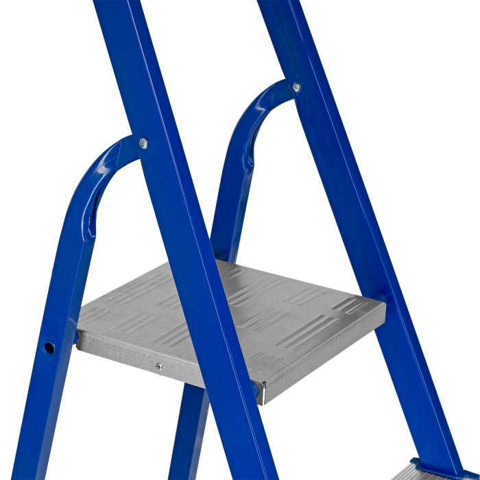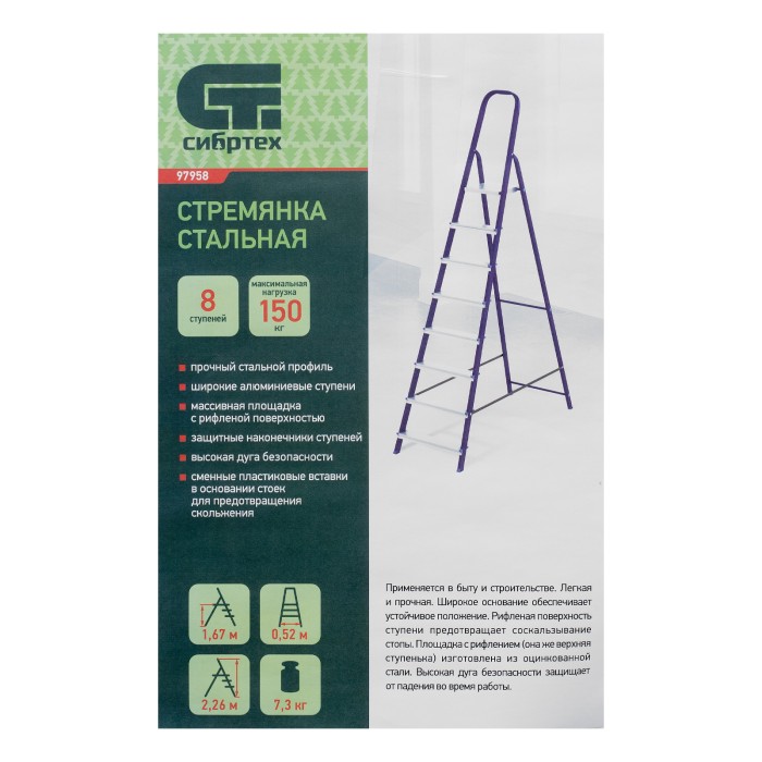 Стремянка Сибртех 97958 со стальным профилем и 8 ступенями, 7 из которых алюминиевые, упрощает доступ к предметам, расположенным на антресолях, шкафах, высоких полках. Также будет полезна для проведения отделочных и монтажных работ. Лестница обладает высокой прочностью при весе 8,5 кг и выдерживает нагрузку до 150 кг. Площадка находится на высоте 166,6 см от опорной поверхности, рабочая высота стремянки составляет 366,6 см (при среднем росте пользователя 170 см).Стремянку следует устанавливать на ровную поверхность, работать на ней с электроинструментом нельзя.ПреимуществаНадежность — рама изготовлена из профилированной стали, стальная верхняя площадка с зацепами прочно фиксирует стремянку в рабочем положении, страховочные ленты придают дополнительную прочность конструкции.Долговечность — покрытие из порошковой эмали антрацитового цвета защищает стальную поверхность от коррозии.Безопасность пользователя — на всех ступенях имеется рифление, пластиковые накладки по краям защищают от травм.Защита напольного покрытия — опоры с пластиковыми рифлеными наконечниками не скользят и не оставляют царапин.Комфортная работа — стремянка имеет широкие ступени и высокую дугу безопасности.Удобное хранение и транспортировка — размеры лестницы в сложенном состоянии 2410 х 530 х 112 мм.Внешний вид товара может незначительно отличаться от указанного на изображении, что не влечет изменения его качества.