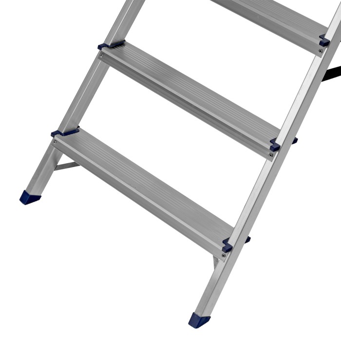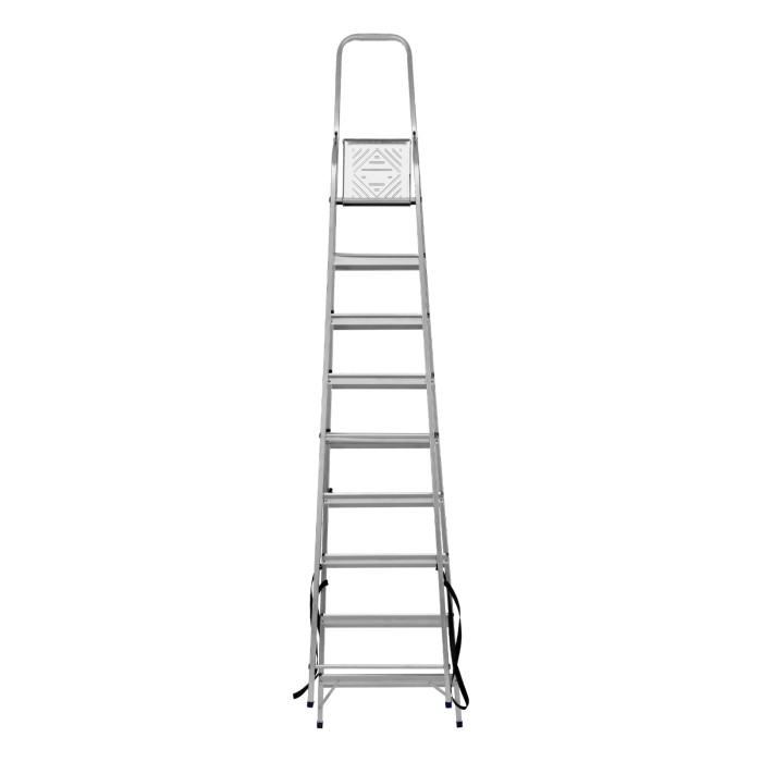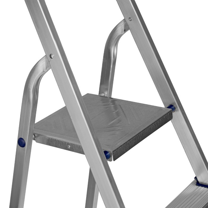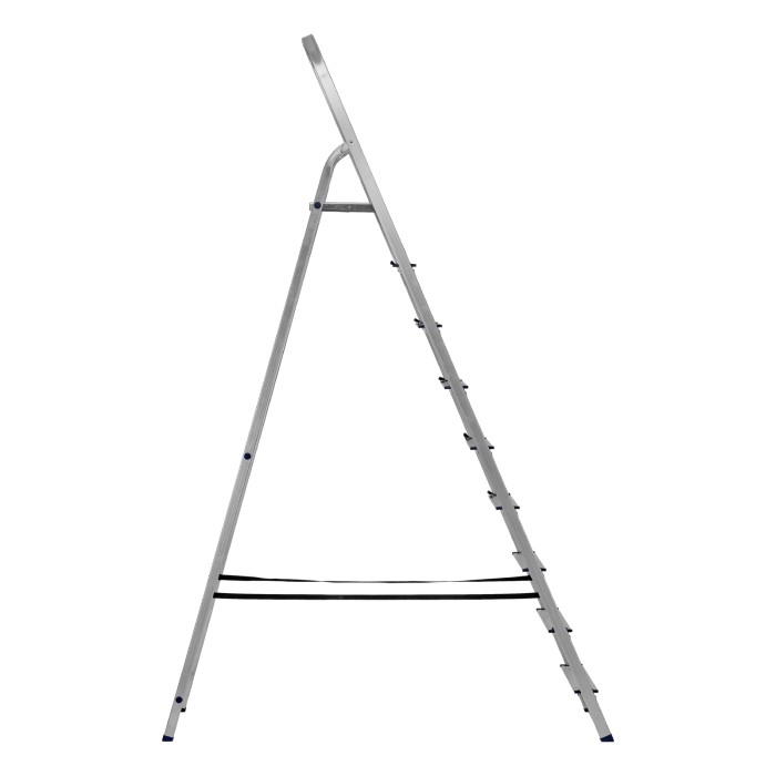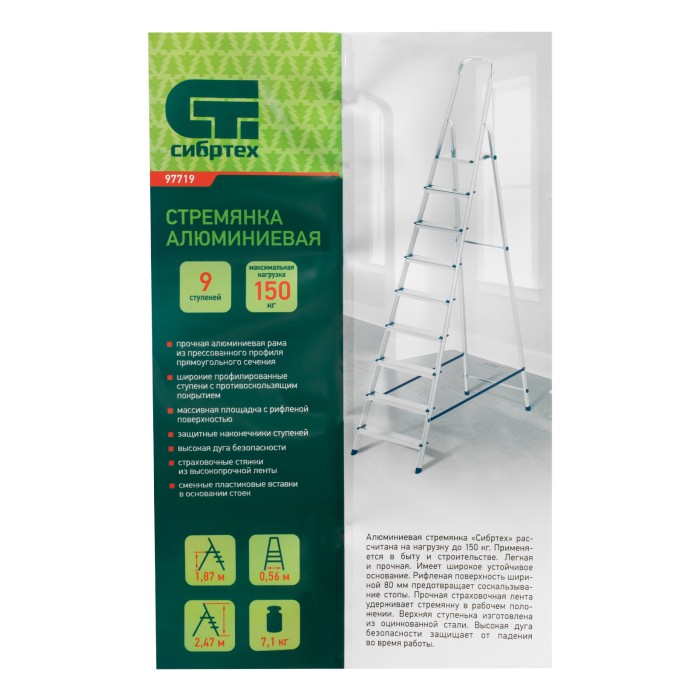 Стремянка алюминиевая Сибртех 97719 с 9 ступенями предназначена для выполнения работ на высоте, превышающей человеческий рост. Высокая дуга безопасности обеспечивает устойчивое положение пользователя. Площадка находится на высоте 186,9 см от опорной поверхности, рабочая высота стремянки составляет 386,9 см (при среднем росте пользователя 170 см). Стремянка пригодится во время строительных и ремонтных работ, будет полезна на даче или в гараже.Стремянка устанавливается на плоскую поверхность и не предназначена для работы с электроинструментом.ПреимуществаПродуманная конструкция — стальная рабочая площадка с зацепами надежно фиксирует стремянку в разложенном положении.Надежность — рама из прямоугольного алюминиевого профиля выдерживает нагрузку до 150 кг, широкие ступени закреплены заклепками, страховочные стяжки повышают прочность конструкции.Безопасность пользователя — рифленая поверхность ступеней предотвращает скольжение, пластиковые накладки на углах снижают риск травмирования.Защита опорной поверхности от царапин — на ножках имеются пластиковые заглушки.Удобное хранение и транспортировка — габариты стремянки в сложенном виде 2693 х 561 х 115 мм.Внешний вид товара может незначительно отличаться от указанного на изображении, что не влечет изменения его качества.