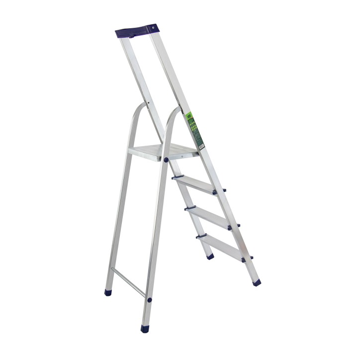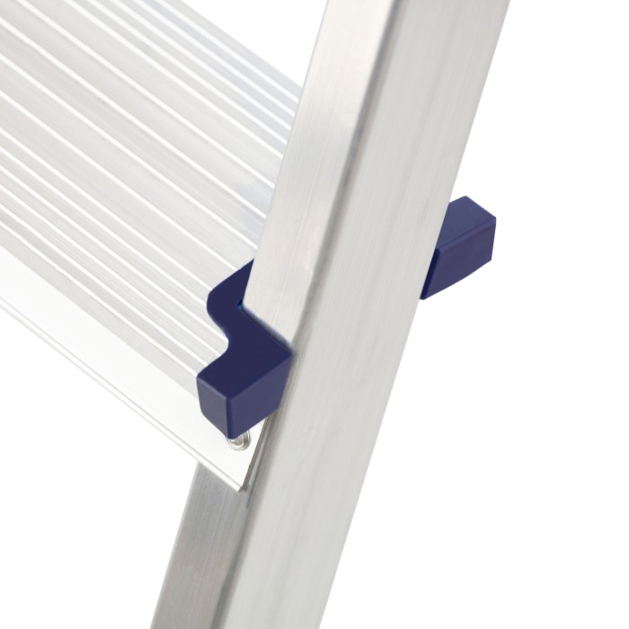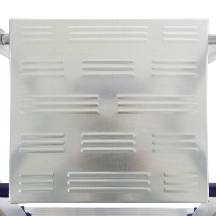 Стремянка алюминиевая Сибртех «Универсал» 97894 с 4 ступенями — складная лестница для отделочных и монтажных работ на высоте, превышающей человеческий рост. Площадка находится на высоте 81,5 см от опорной поверхности, рабочая высота стремянки составляет 281,5 см (при среднем росте пользователя 170 см). Высокая дуга обеспечивает безопасность пользователя. Стремянка удобна для длительной работы, используется во время строительства и ремонта, а также в быту. Устанавливать стремянку следует на ровную плоскость. Она не предназначена для работы с электроинструментом.ПреимуществаНадежная фиксация в разложенном положении — массивная стальная верхняя площадка имеет зацепы.Прочная конструкция — алюминиевая рама изготовлена из прессованного прямоугольного профиля, имеет усиленный узел крепления передней и задней опор, поэтому выдерживает вес в 150 кг.Безопасный подъем и спуск — ступени имеют рифленую поверхность, пластиковые накладки на углах предотвращают травмирование пользователя.Дополнительные возможности — в верхней части дуги предусмотрен органайзер, в который можно сложить крепеж, а также закрепить в нем 2 отвертки, на крюк можно повесить раскладку с инструментами.Защита напольного покрытия — на ножках имеются пластиковые заглушки, поэтому они не скользят и не оставляют царапины.Удобное хранение и транспортировка — стремянка весит 3,2 кг, в сложенном состоянии имеет размеры 1500 х 440 х 110 мм.
