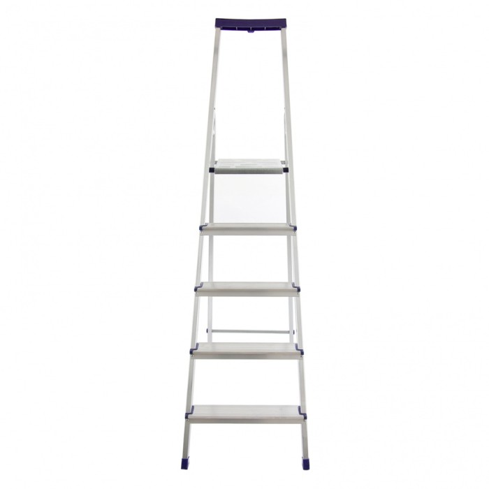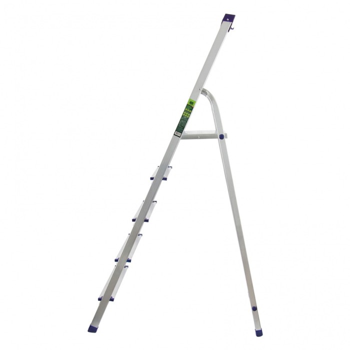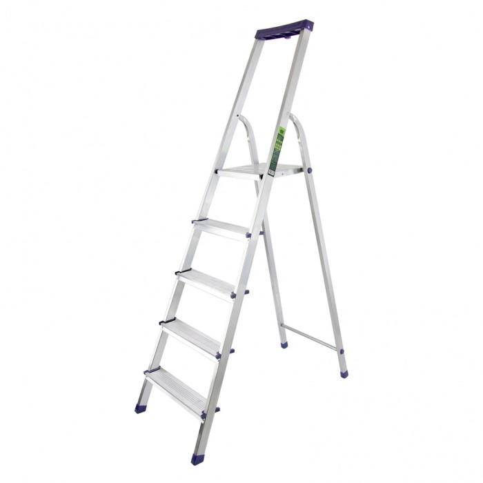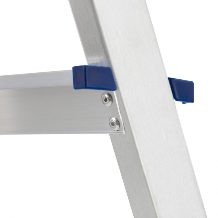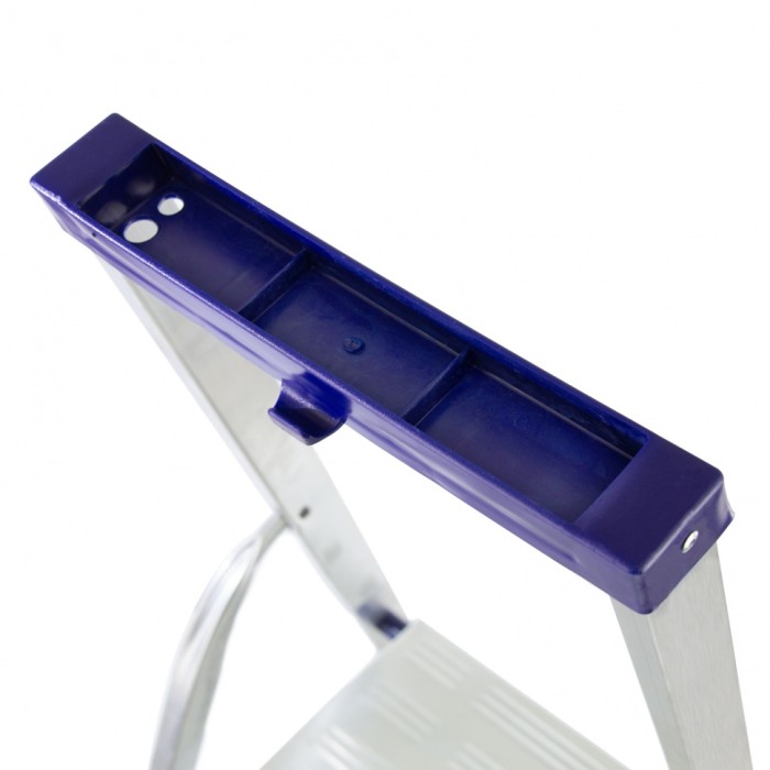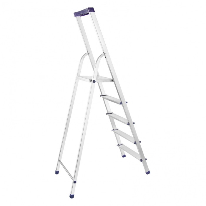 Стремянка алюминиевая Сибртех «Универсал» 97895 с 5 ступенями — складная лестница для отделочных и монтажных работ на высоте, превышающей человеческий рост. Площадка находится на высоте 103 см от опорной поверхности, рабочая высота стремянки составляет 303 см (при среднем росте пользователя 170 см). Высокая дуга обеспечивает безопасность пользователя. Стремянка удобна для длительной работы, используется во время строительства и ремонта, а также в быту. Устанавливать стремянку следует на ровную плоскость. Она не предназначена для работы с электроинструментом.ПреимуществаНадежная фиксация в разложенном положении — массивная стальная верхняя площадка имеет зацепы.Прочная конструкция — алюминиевая рама изготовлена из прессованного прямоугольного профиля, имеет усиленный узел крепления передней и задней опор, поэтому выдерживает вес в 150 кг.Безопасный подъем и спуск — ступени имеют рифленую поверхность, пластиковые накладки на углах предотвращают травмирование пользователя.Дополнительные возможности — в верхней части дуги предусмотрен органайзер, в который можно сложить крепеж, а также закрепить в нем 2 отвертки, на крюк можно повесить раскладку с инструментами.Защита напольного покрытия — на ножках имеются пластиковые заглушки, поэтому они не скользят и не оставляют царапины.Удобное хранение и транспортировка — стремянка весит 3,8 кг, в сложенном состоянии имеет размеры 1730 х 460 х 110 мм.