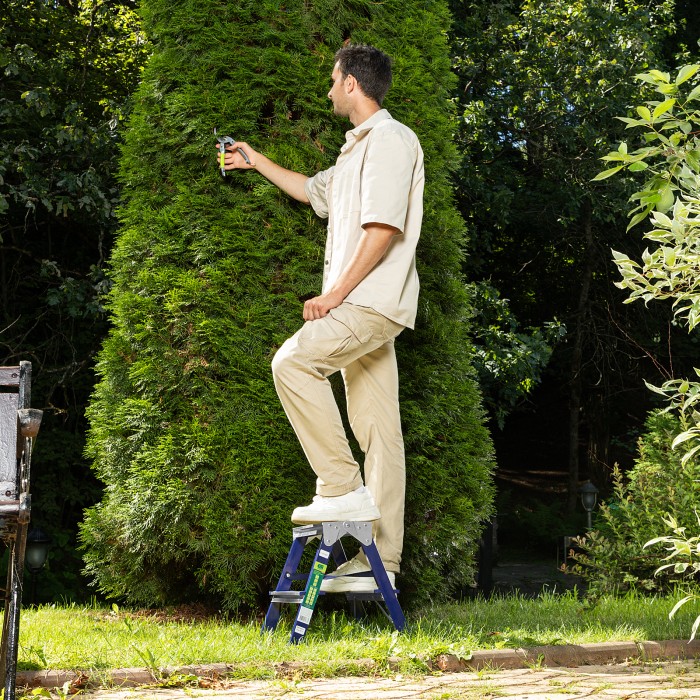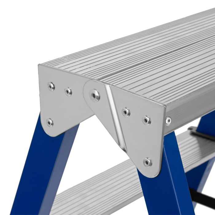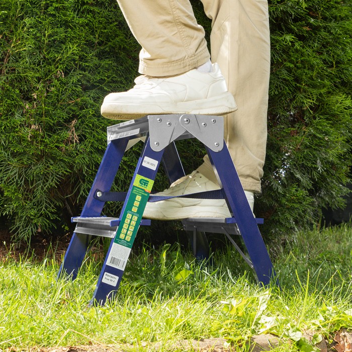 Стремянка двусторонняя стальная Сибртех 97932 с 2 ступенями используется строителями, работниками коммунальных служб, а также полезна в быту. Незаменима, если нужно выполнить монтажные или отделочные работы на высоте, провести уборку, а также достать нужные предметы с антресолей или верхней полки шкафа. На широких ступенях комфортно стоять. Площадка находится на высоте 40,2 см от опорной поверхности, рабочая высота стремянки составляет 240,2 см (при среднем росте пользователя 170 см). Стальная рама прямоугольного сечения выдерживает нагрузку до 150 кг.Во время работы следует соблюдать технику безопасности — устанавливать стремянку на ровную поверхность и не пользоваться электроинструментом.ПреимуществаНадежность — нейлоновые страховочные стяжки повышают прочность конструкции.Коррозионная стойкость — стальная рама покрыта порошковой эмалью.Безопасность пользователя — широкие алюминиевые ступени не прогибаются, рифление на поверхности не дает поскользнуться.Защита от порезов и царапин — углы ступеней закрыты пластиковыми накладками.Пластиковые заглушки на опорах — стремянка не скользит и не царапает напольное покрытие.Компактность — стремянка весом 2,2 кг имеет габариты в сложенном состоянии 437 х 420 х 160,5 мм, поэтому ее удобно хранить и перемещать.Внешний вид товара может незначительно отличаться от указанного на изображении, что не влечет изменения его качества.