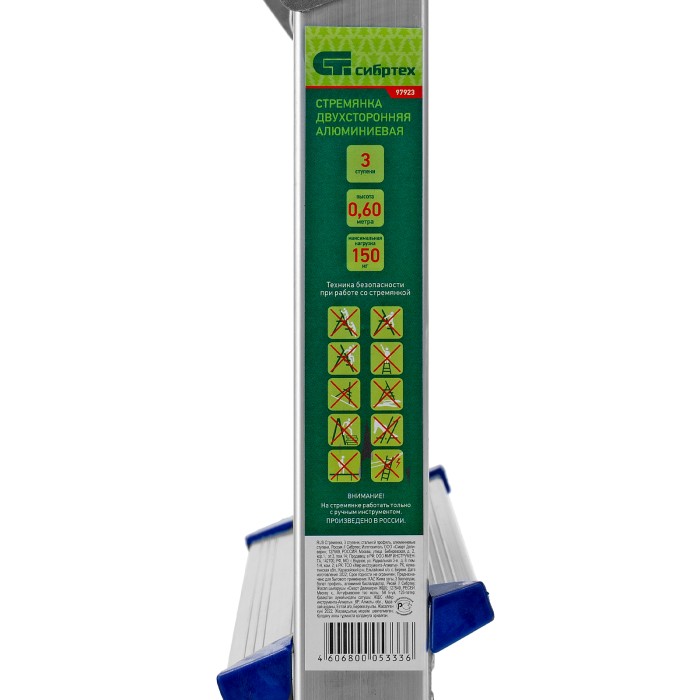 Стремянка двусторонняя алюминиевая Сибртех 97923 с 3 ступенями позволяет выполнять различные действия на высоте — штукатурить или красить стены, менять лампочки, вытирать пыль, доставать нужные предметы с верхних полок. Площадка находится на высоте 60,4 см от опорной поверхности, рабочая высота стремянки составляет 260,4 см (при среднем росте пользователя 170 см).Стремянку следует устанавливать на ровную плоскость. Работа с электроинструментом не допускается.ПреимуществаДолговечность — стремянка выполнена из легкого, но прочного алюминия, устойчивого к коррозии.Устойчивость к высоким нагрузкам — рама из прессованного алюминиевого профиля выдерживает до 150 кг.Продуманная конструкция — нейлоновые страховочные стяжки повышают надежность фиксации стремянки в рабочем положении.Комфорт и безопасность — широкие ступени удобны для длительной работы, а пластиковые накладки на них защищают пользователя от травм.Антискользящие свойства — ступени имеют рифленую поверхность.Защита напольного покрытия — опоры с пластиковыми рифлеными наконечниками не скользят и не оставляют царапин.Вес 2,4 кг — стремянку легко сможет установить пользователь с любым уровнем подготовки.Удобное хранение и транспортировка — размеры сложенной лестницы 660 х 435 х 160,5 мм.Внешний вид товара может незначительно отличаться от указанного на изображении, что не влечет изменения его качества.