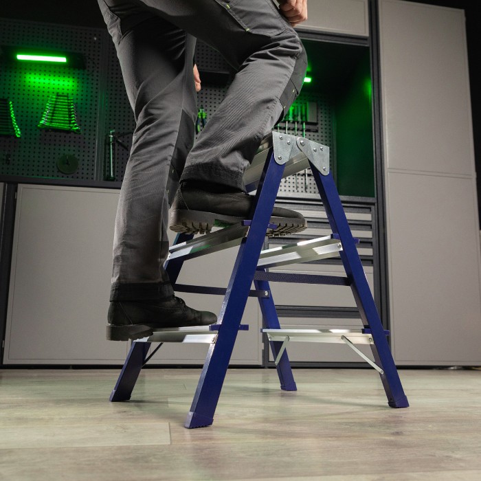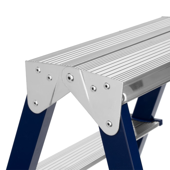 Стремянка двусторонняя стальная Сибртех 97933 с 3 ступенями используется строителями, работниками коммунальных служб, а также полезна в быту. Незаменима, если нужно выполнить монтажные или отделочные работы на высоте, провести уборку, а также достать нужные предметы с антресолей или верхней полки шкафа. На широких ступенях комфортно стоять. Площадка находится на высоте 60,4 см от опорной поверхности, рабочая высота стремянки составляет 260,4 см (при среднем росте пользователя 170 см). Стальная рама прямоугольного сечения выдерживает нагрузку до 150 кг.Во время работы следует соблюдать технику безопасности — устанавливать стремянку на ровную поверхность и не пользоваться электроинструментом.ПреимуществаНадежность — нейлоновые страховочные стяжки повышают прочность конструкции.Коррозионная стойкость — стальная рама покрыта порошковой эмалью.Безопасность пользователя — широкие алюминиевые ступени не прогибаются, рифление на поверхности не дает поскользнуться.Защита от порезов и царапин — углы ступеней закрыты пластиковыми накладками.Пластиковые заглушки на опорах — стремянка не скользит и не царапает напольное покрытие.Компактность — стремянка весом 3,2 кг имеет габариты в сложенном состоянии 660 х 435 х 160,5 мм, поэтому ее удобно хранить и перемещать.Внешний вид товара может незначительно отличаться от указанного на изображении, что не влечет изменения его качества.
