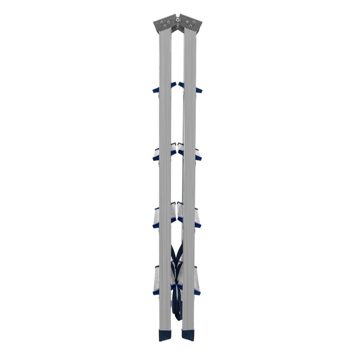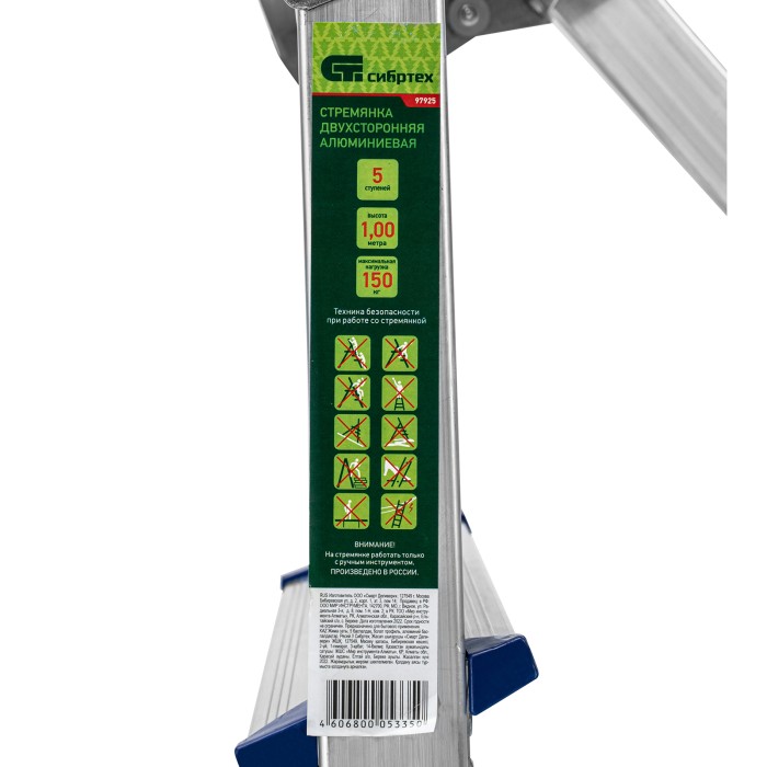 Стремянка двусторонняя алюминиевая Сибртех 97925 с 5 ступенями позволяет выполнять различные действия на высоте — штукатурить или красить стены, менять лампочки, вытирать пыль, доставать нужные предметы с верхних полок. Площадка находится на высоте 100,4 см от опорной поверхности, рабочая высота стремянки составляет 300,4 см (при среднем росте пользователя 170 см).Стремянку следует устанавливать на ровную плоскость. Работа с электроинструментом не допускается.ПреимуществаДолговечность — стремянка выполнена из легкого, но прочного алюминия, устойчивого к коррозии.Устойчивость к высоким нагрузкам — рама из прессованного алюминиевого профиля выдерживает до 150 кг.Продуманная конструкция — нейлоновые страховочные стяжки повышают надежность фиксации стремянки в рабочем положении.Комфорт и безопасность — широкие ступени удобны для длительной работы, а пластиковые накладки на них защищают пользователя от травм.Антискользящие свойства — ступени имеют рифленую поверхность.Защита напольного покрытия — опоры с пластиковыми рифлеными наконечниками не скользят и не оставляют царапин.Вес 3,6 кг — стремянку легко сможет установить пользователь с любым уровнем подготовки.Удобное хранение и транспортировка — размеры сложенной лестницы 1120 х 484 х 160,5 мм.Внешний вид товара может незначительно отличаться от указанного на изображении, что не влечет изменения его качества.