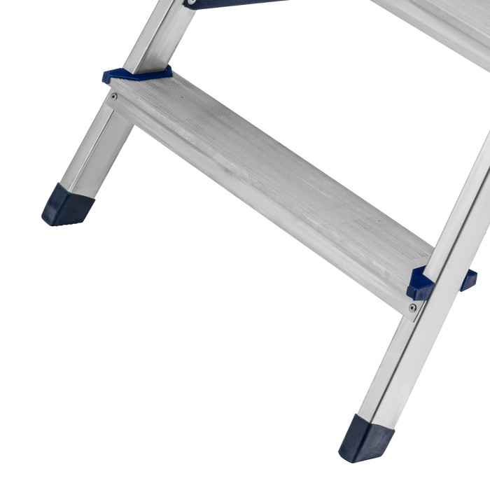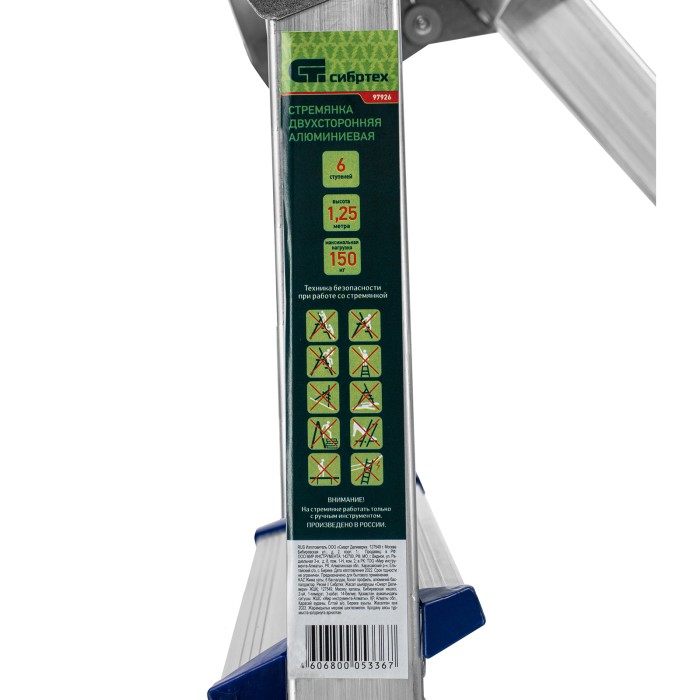 Стремянка двусторонняя алюминиевая Сибртех 97926 с 6 ступенями позволяет выполнять различные действия на высоте — штукатурить или красить стены, менять лампочки, вытирать пыль, доставать нужные предметы с верхних полок. Площадка находится на высоте 125,3 см от опорной поверхности, рабочая высота стремянки составляет 325,3 см (при среднем росте пользователя 170 см).Стремянку следует устанавливать на ровную плоскость. Работа с электроинструментом не допускается.ПреимуществаДолговечность — стремянка выполнена из легкого, но прочного алюминия, устойчивого к коррозии.Устойчивость к высоким нагрузкам — рама из прессованного алюминиевого профиля выдерживает до 150 кг.Продуманная конструкция — нейлоновые страховочные стяжки повышают надежность фиксации стремянки в рабочем положении.Комфорт и безопасность — широкие ступени удобны для длительной работы, а пластиковые накладки на них защищают пользователя от травм.Антискользящие свойства — ступени имеют рифленую поверхность.Защита напольного покрытия — опоры с пластиковыми рифлеными наконечниками не скользят и не оставляют царапин.Вес 4,4 кг — стремянку легко сможет установить пользователь с любым уровнем подготовки.Удобное хранение и транспортировка — размеры сложенной лестницы 1355 х 505 х 160,5 мм.Внешний вид товара может незначительно отличаться от указанного на изображении, что не влечет изменения его качества.