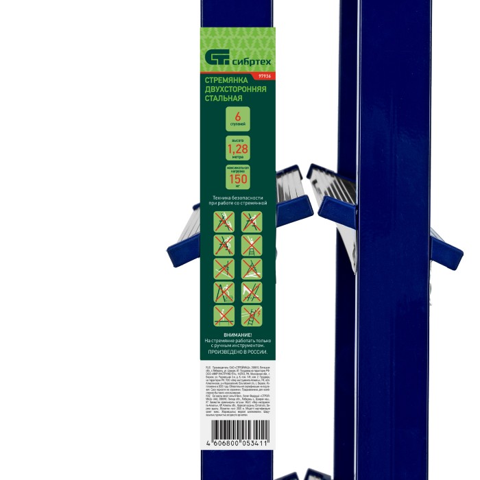 Стремянка двусторонняя стальная Сибртех 97936 с 6 ступенями используется строителями, работниками коммунальных служб, а также полезна в быту. Незаменима, если нужно выполнить монтажные или отделочные работы на высоте, провести уборку, а также достать нужные предметы с антресолей или верхней полки шкафа. На широких ступенях комфортно стоять. Площадка находится на высоте 125,3 см от опорной поверхности, рабочая высота стремянки составляет 325,3 см (при среднем росте пользователя 170 см). Стальная рама прямоугольного сечения выдерживает нагрузку до 150 кг.Во время работы следует соблюдать технику безопасности — устанавливать стремянку на ровную поверхность и не пользоваться электроинструментом.ПреимуществаНадежность — нейлоновые страховочные стяжки повышают прочность конструкции.Коррозионная стойкость — стальная рама покрыта порошковой эмалью.Безопасность пользователя — широкие алюминиевые ступени не прогибаются, их рифленая поверхность не дает поскользнуться.Защита от порезов и царапин — углы ступеней закрыты пластиковыми накладками.Пластиковые заглушки на опорах — стремянка не скользит и не царапает напольное покрытие.Компактность — стремянка весом 6,2 кг имеет габариты в сложенном состоянии 1355 х 550 х 160,5 мм, поэтому ее удобно хранить и перемещать.Внешний вид товара может незначительно отличаться от указанного на изображении, что не влечет изменения его качества.