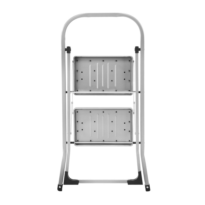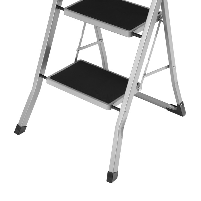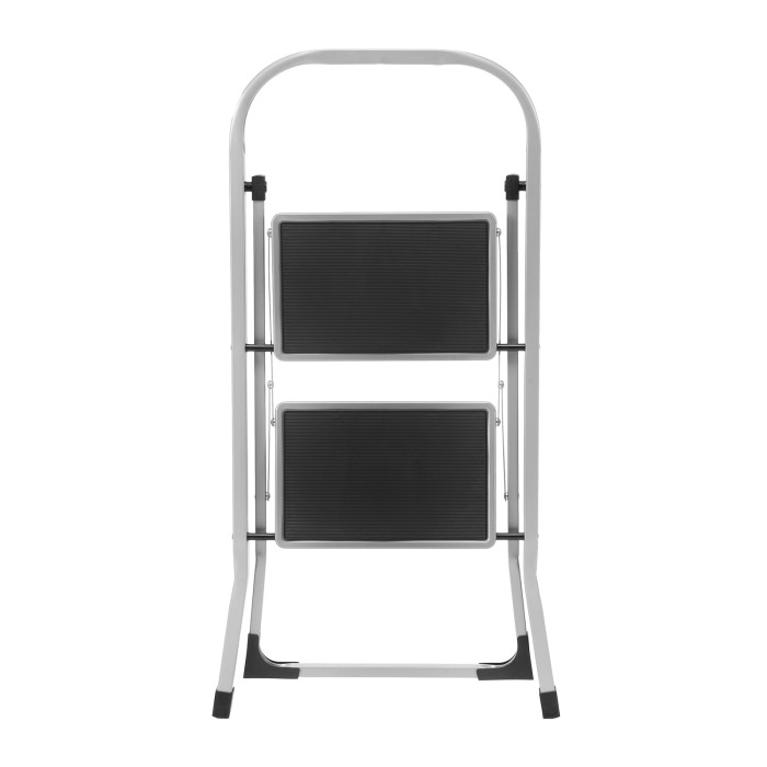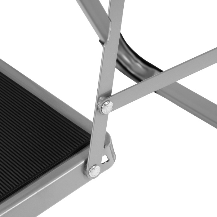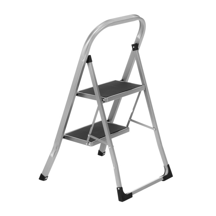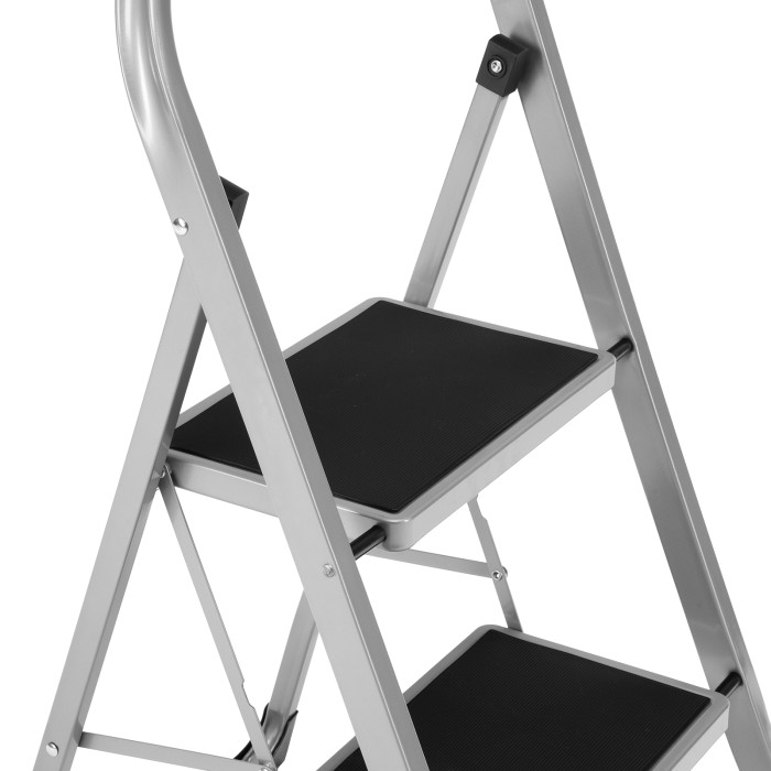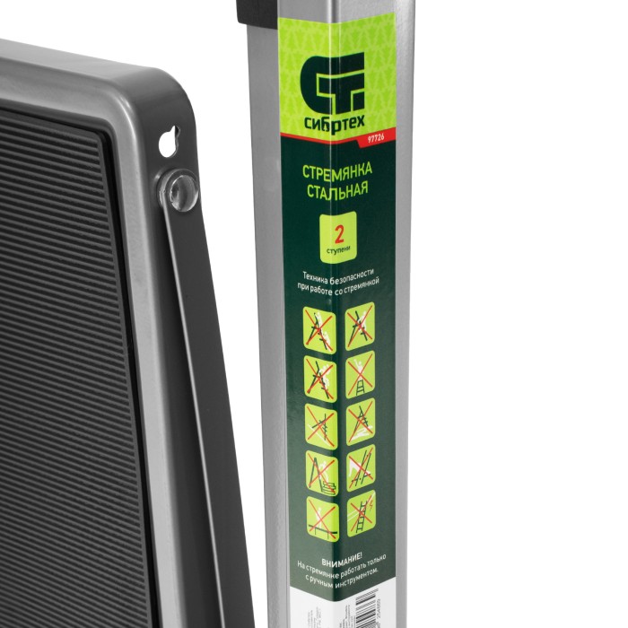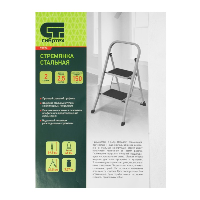 Стальная стремянка Сибртех 97726 с 2 широкими ступенями размером 20 x 30 см, с полимерным покрытием, позволяет выполнять различные работы на высоте, превышающей человеческий рост. С ее помощью можно достать нужный предмет с полки, покрасить стену, поменять лампочку, вытереть пыль на шкафу и т.д. Верхняя ступень находится на высоте 46,7 см от опорной поверхности, рабочая высота составляет 246,7 см (при среднем росте пользователя 170 см). Дуга безопасности и широкие ступени с нескользящим покрытием обеспечивают устойчивое положение пользователя. Стремянку следует размещать на ровной поверхности и использовать для работы только с ручным инструментом.ПреимуществаПрочная конструкция — стремянка изготовлена из стального профиля и снабжена надежным механизмом раскладывания, поэтому выдерживает нагрузку до 150 кг.Защита от разрушения — стальной профиль покрыт антикоррозийной краской.Защита напольного покрытия — благодаря пластиковым накладкам ножки не царапают опорную поверхность.Малый вес 3,37 кг — стремянку можно легко переместить в нужное место.Удобное хранение — за счет толщины в сложенном виде 4,5 см стремянка не занимает много места.