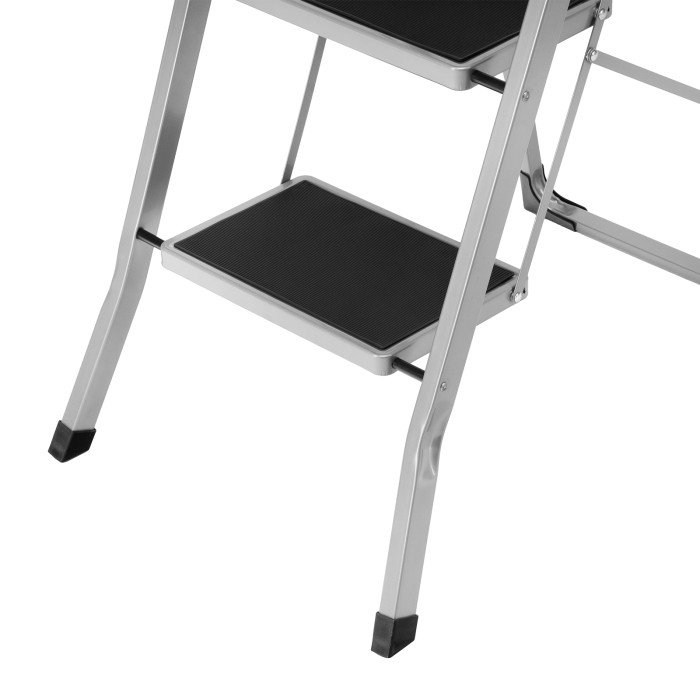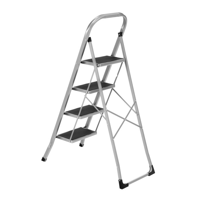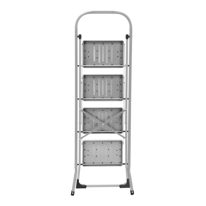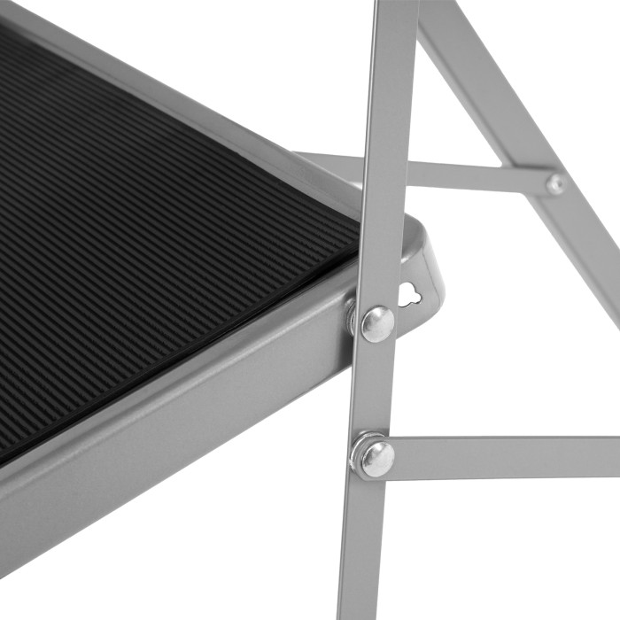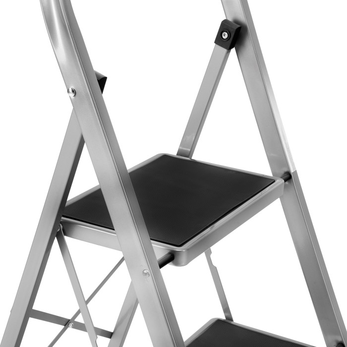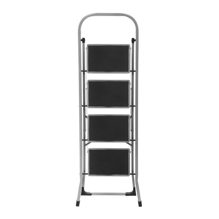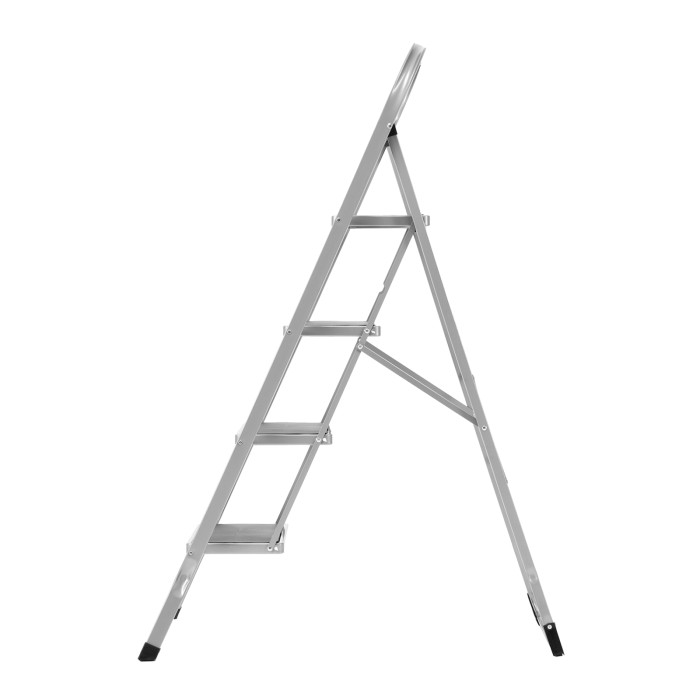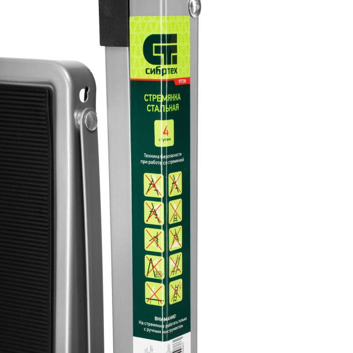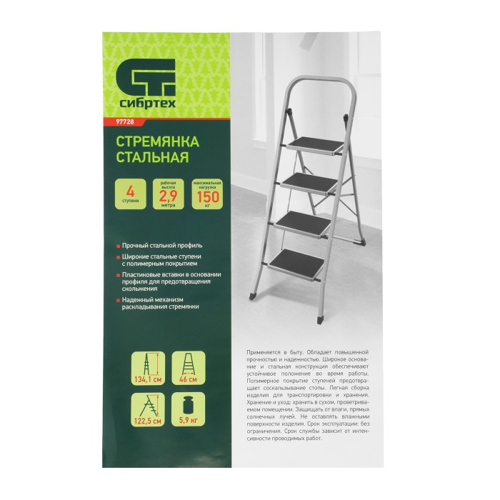 Стальная стремянка Сибртех 97728 с 4 широкими ступенями размером 20 x 30 см, с полимерным покрытием, позволяет выполнять различные работы на высоте, превышающей человеческий рост. С ее помощью можно достать нужный предмет с полки, покрасить стену, поменять лампочку, вытереть пыль на шкафу и т.д. Верхняя ступень находится на высоте 88 см от опорной поверхности, рабочая высота составляет 288 см (при среднем росте пользователя 170 см). Дуга безопасности и широкие ступени с нескользящим покрытием обеспечивают устойчивое положение пользователя. Стремянку следует размещать на ровной поверхности и использовать для работы только с ручным инструментом.ПреимуществаПрочная конструкция — стремянка изготовлена из стального профиля и снабжена надежным механизмом раскладывания, поэтому выдерживает нагрузку до 150 кг.Защита от разрушения — стальной профиль покрыт антикоррозийной краской.Защита напольного покрытия — благодаря пластиковым накладкам ножки не царапают опорную поверхность.Малый вес 5,9 кг — стремянку можно легко переместить в нужное место.Удобное хранение — за счет толщины в сложенном виде 4,5 см стремянка не занимает много места.