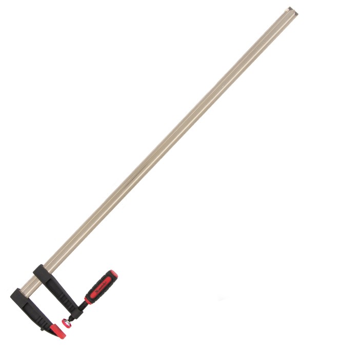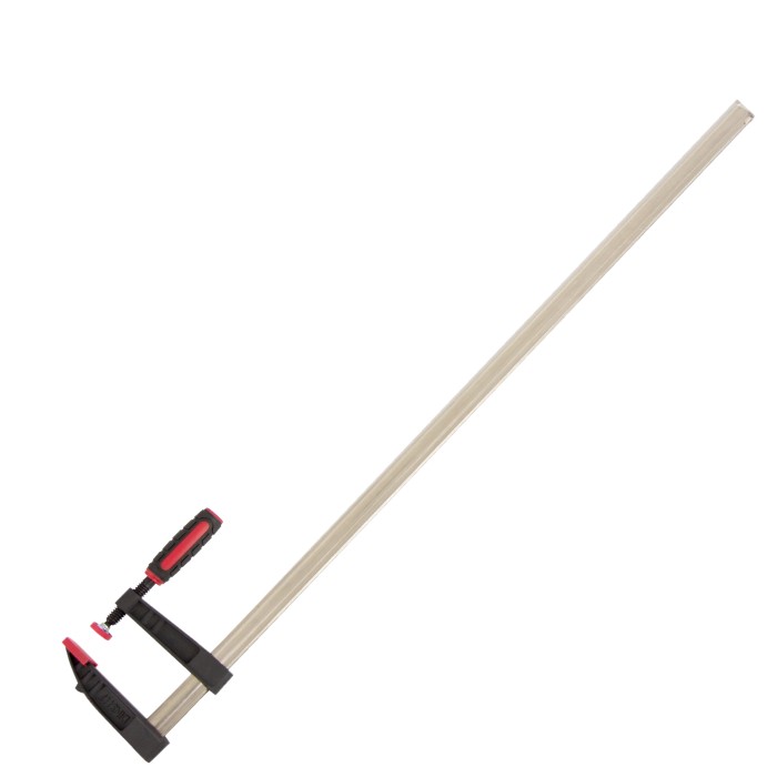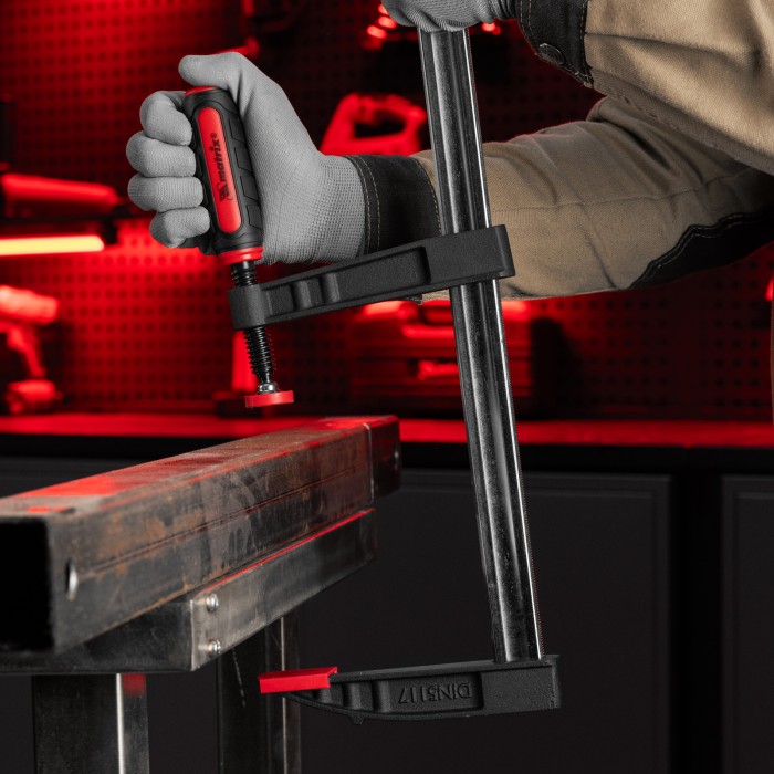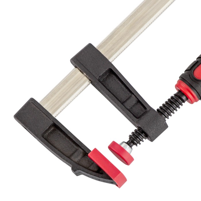 F-образная струбцина Matrix 20410 размером 1000 х 120 х 1100 мм используется для зажима металлических, деревянных и других заготовок для их последующей обработки или сборки. Представляет собой штангу, на которой установлено 2 кронштейна — неподвижный и подвижный. Деталь помещается между ними и прижимается к губкам при помощи винтового зажима с трапециевидной резьбой. Подвижный кронштейн позволяет регулировать величину захвата, которая может достигать 1000 мм. Струбцину применяют для выполнения слесарных и столярных работ. ПреимуществаНадежность — стальная штанга выдерживает повышенные нагрузки и позволяет фиксировать заготовки со значительным усилием.Аккуратная работа — пластиковые накладки на губках предотвращают повреждение детали при сжатии.Возможность использования для сварочных работ — металлическая конструкция выдерживает высокую температуру (перед началом сварки необходимо снять пластиковые накладки с губок).Эргономичность — двухкомпонентная обрезиненная рукоятка с рельефным дизайном не выскальзывает из ладони.