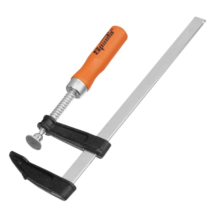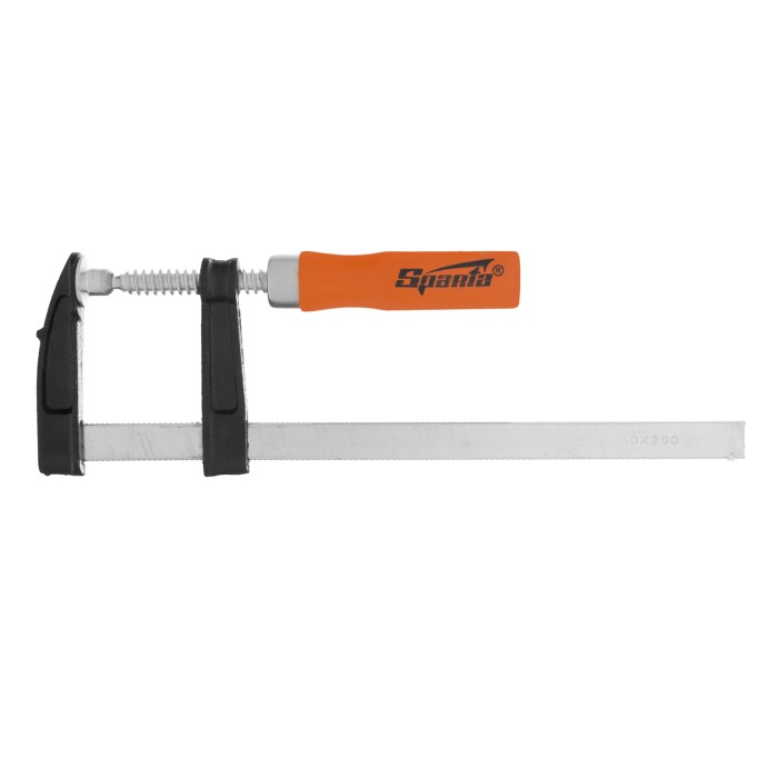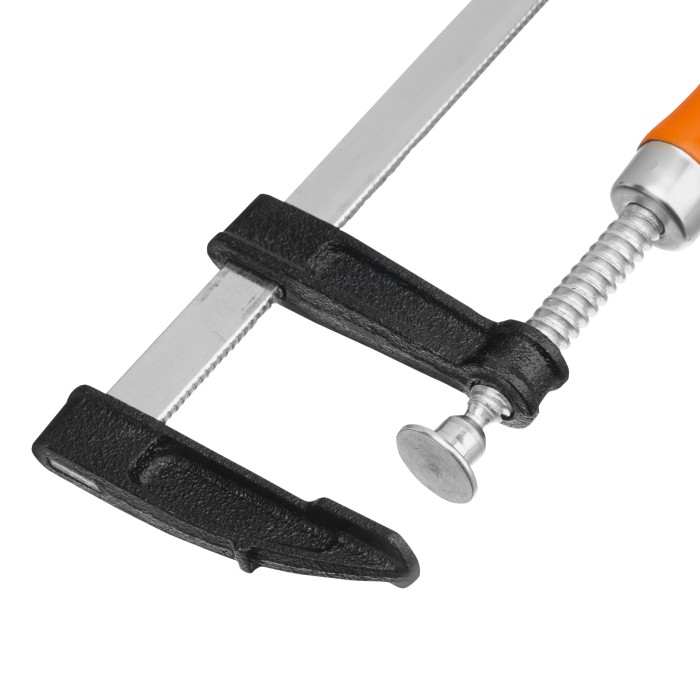 F-образная струбцина Sparta 204265 длиной 250 мм и величиной зажима 200 х 50 мм позволяет фиксировать заготовки из металла, древесины и других материалов для их соединения или обработки. Используется в столярном и слесар...