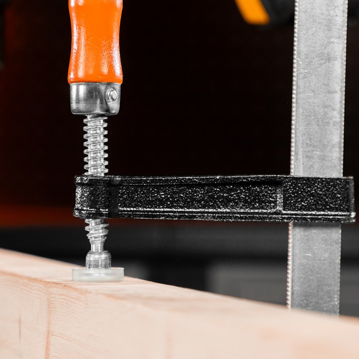 F-образная струбцина Sparta 204355 длиной 360 мм и величиной зажима 300 х 80 мм позволяет фиксировать заготовки из металла, древесины и других материалов для их соединения или обработки. Используется в столярном и слесарном деле. Деталь помещают между губками, одна из которых подвижна и служит для регулировки величины захвата. Винтовой зажим позволяет фиксировать заготовку со значительным усилием. Элементы конструкции выдерживают высокую температуру, поэтому струбцина подходит для проведения сварочных работ, при этом пластиковые накладки необходимо снять.ПреимуществаПрочность — стальная штанга выдерживает значительные изгибающие нагрузки.Длительный срок службы — оцинкованный винт устойчив к коррозии.Аккуратная работа — защитные накладки на губках предотвращают повреждение детали.Комфортная эксплуатация — удобная деревянная рукоятка надежно ложится в руку.
