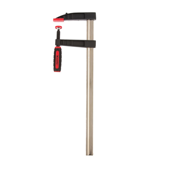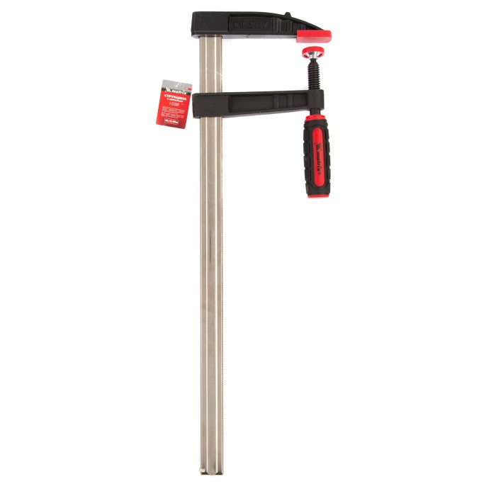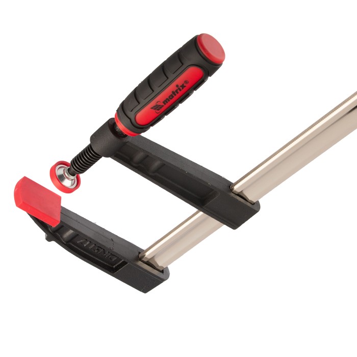 F-образная струбцина Matrix 20407 размером 500 х 120 х 600 мм используется для зажима металлических, деревянных и других заготовок для их последующей обработки или сборки. Представляет собой штангу, на которой установлено 2 кронштейна — неподвижный и подвижный. Деталь помещается между ними и прижимается к губкам при помощи винтового зажима с трапециевидной резьбой. Подвижный кронштейн позволяет регулировать величину захвата, которая может достигать 500 мм. Струбцину применяют для выполнения слесарных и столярных работ. ПреимуществаНадежность — стальная штанга выдерживает повышенные нагрузки и позволяет фиксировать заготовки со значительным усилием.Аккуратная работа — пластиковые накладки на губках предотвращают повреждение детали при сжатии.Возможность использования для сварочных работ — металлическая конструкция выдерживает высокую температуру (перед началом сварки необходимо снять пластиковые накладки с губок).Эргономичность — двухкомпонентная обрезиненная рукоятка с рельефным дизайном не выскальзывает из ладони.