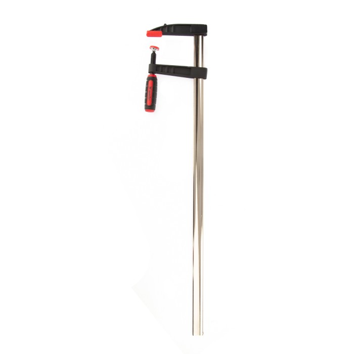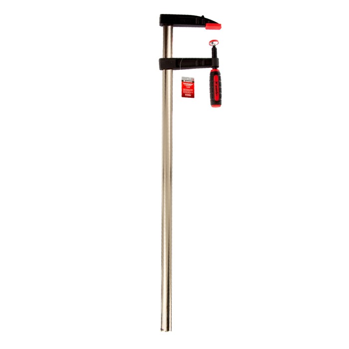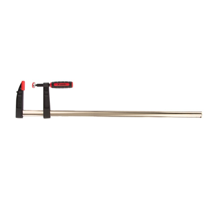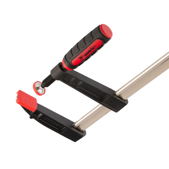 F-образная струбцина Matrix 20408 размером 800 х 120 х 900 мм используется для зажима металлических, деревянных и других заготовок для их последующей обработки или сборки. Представляет собой штангу, на которой установлено 2 кронштейна — неподвижный и подвижный. Деталь помещается между ними и прижимается к губкам при помощи винтового зажима с трапециевидной резьбой. Подвижный кронштейн позволяет регулировать величину захвата, которая может достигать 800 мм. Струбцину применяют для выполнения слесарных и столярных работ. ПреимуществаНадежность — стальная штанга выдерживает повышенные нагрузки и позволяет фиксировать заготовки со значительным усилием.Аккуратная работа — пластиковые накладки на губках предотвращают повреждение детали при сжатии.Возможность использования для сварочных работ — металлическая конструкция выдерживает высокую температуру (перед началом сварки необходимо снять пластиковые накладки с губок).Эргономичность — двухкомпонентная обрезиненная рукоятка с рельефным дизайном не выскальзывает из ладони.