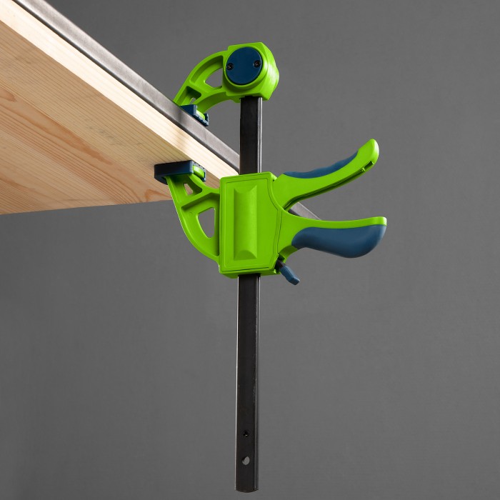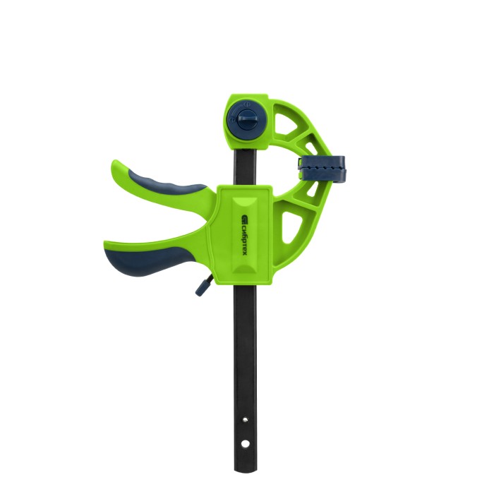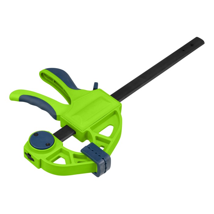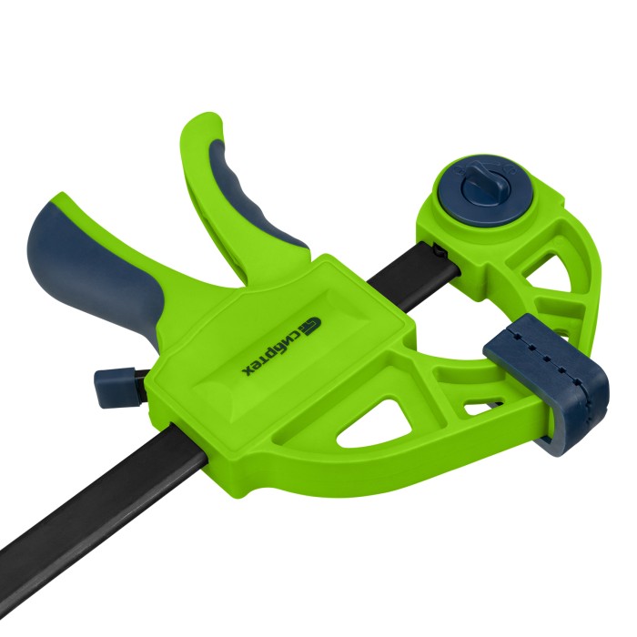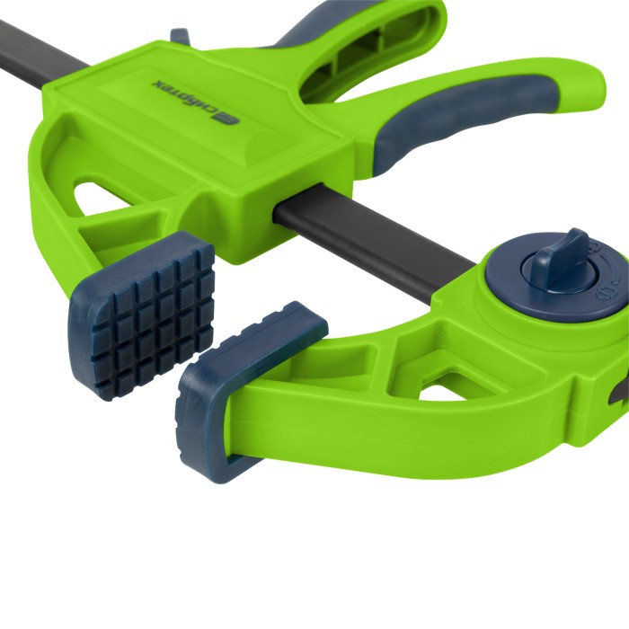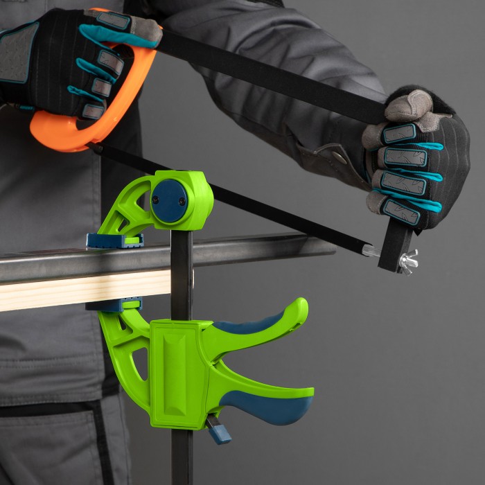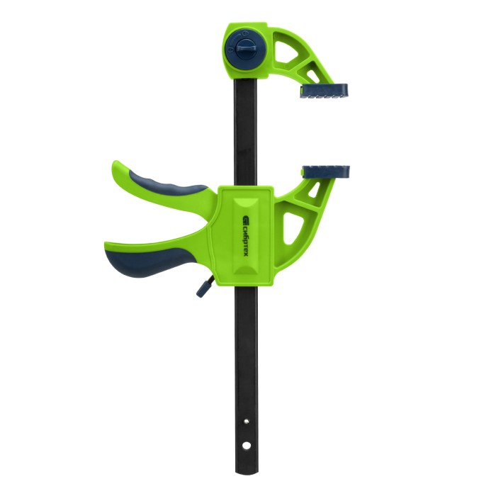 F-образная быстрозажимная струбцина Сибртех 20563 длиной 360 мм, с шириной и глубиной зажима 150 и 70 мм соответственно, в пластиковом корпусе, с фиксатором и двухкомпонентной рукояткой, позволяет зажимать заготовки для их дальнейшей обработки или сборки. Помогает решать множество задач благодаря оптимальной глубине зажима. Пластинчатый механизм пошагово перемещает подвижную губку вдоль направляющей до достижения максимально плотного захвата детали. Фиксатор препятствует движению губки в обратную сторону. Струбцина пригодится в столярной мастерской, а также будет полезна в быту.ПреимуществаНадежная конструкция — штанга изготовлена из стали, а корпус — из ударопрочного ABS-пластика.Аккуратная работа — накладки на губках защищают поверхность зажимаемого предмета от повреждений.Дополнительные возможности — опорную губку можно переставить на другой конец штанги, превратив струбцину в распорный инструмент.Комфортная работа — эргономичные двухкомпонентные рукоятки удобно ложатся в руку.