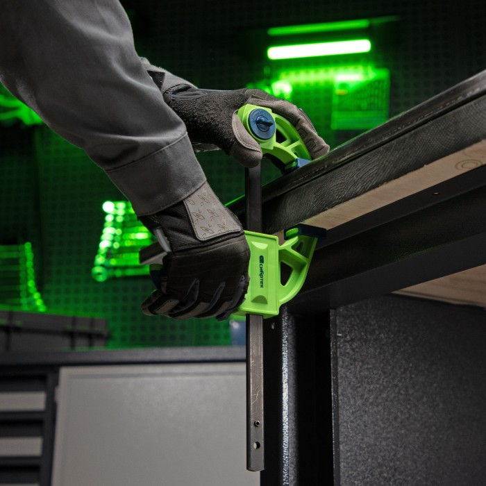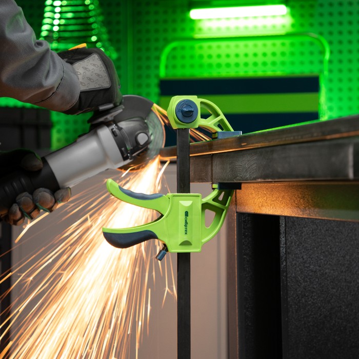 F-образная быстрозажимная струбцина Сибртех 20563 длиной 360 мм, с шириной и глубиной зажима 150 и 70 мм соответственно, в пластиковом корпусе, с фиксатором и двухкомпонентной рукояткой, позволяет зажимать заготовки для ...
