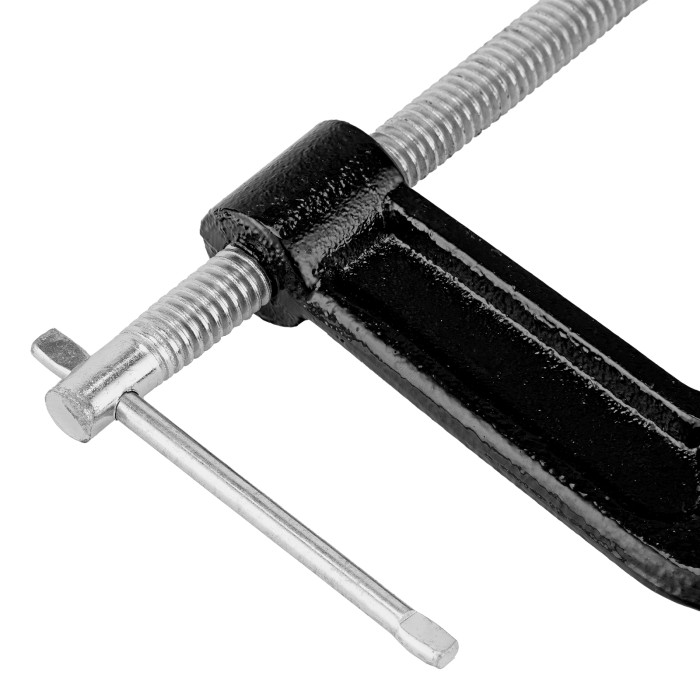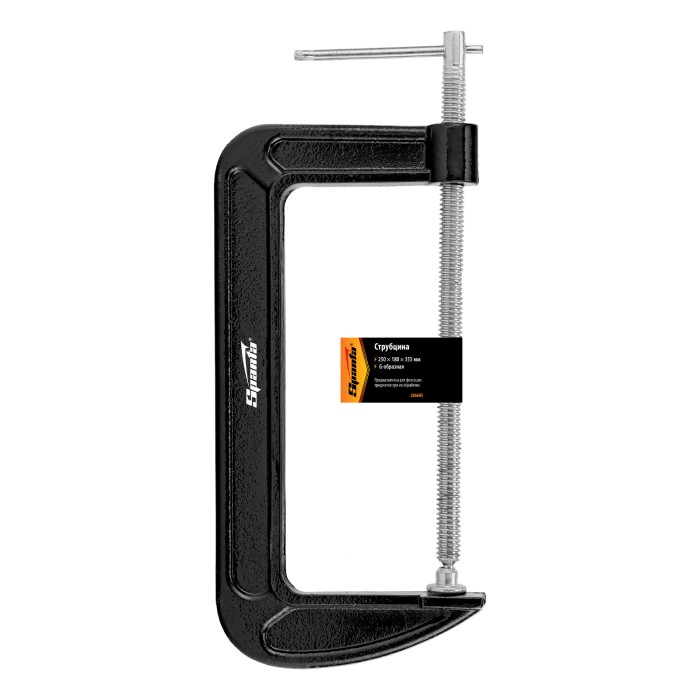 G-образная струбцина Sparta 206685 с шириной зажима 250 мм надежно фиксирует различные детали для дальнейшего склеивания, сверления, пиления, шлифования или сварки. Винт с воротком и крупной червячной резьбой позволяет з...